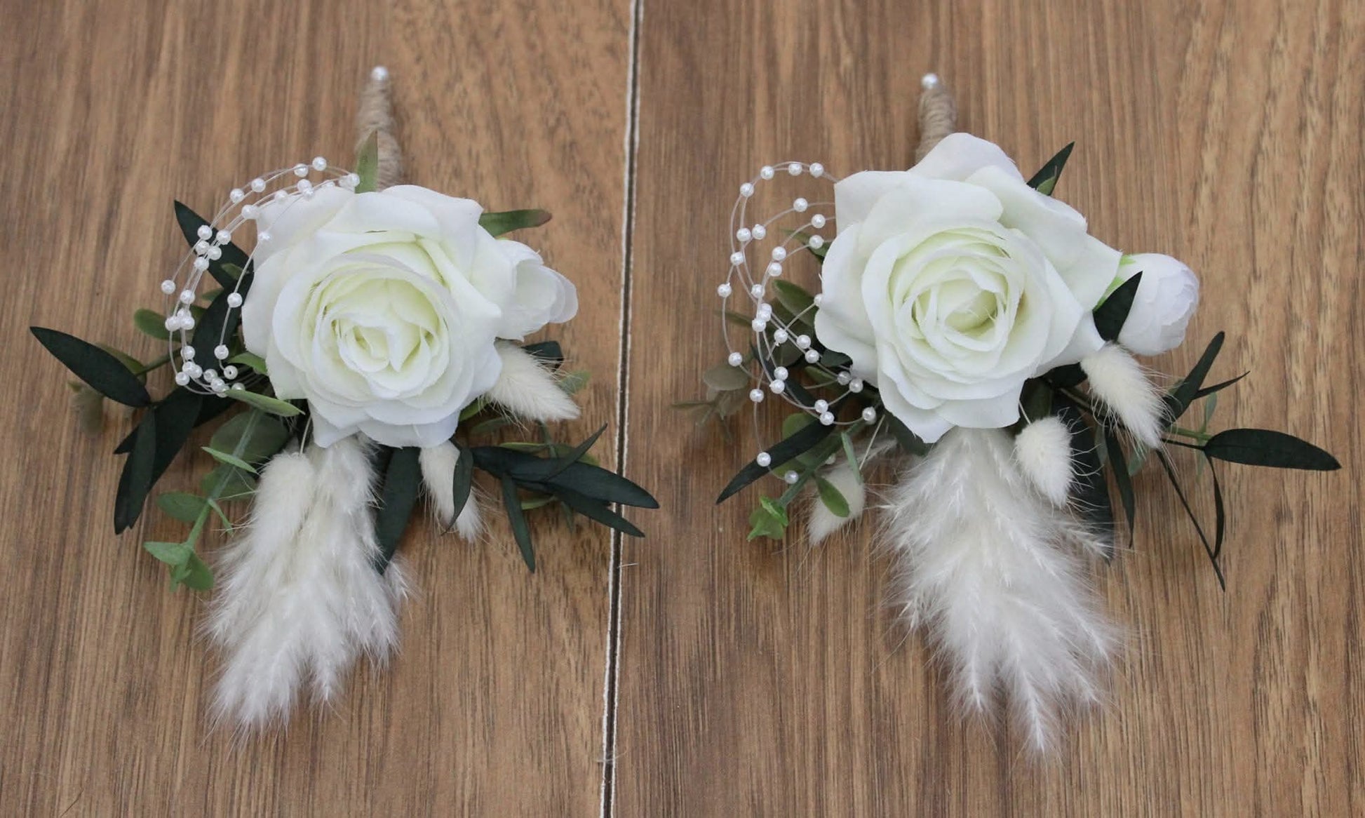 A stunning handmade pin on corsage crafted using using a very high-grade single stem silk rose, eucalyptus, pampas spray and bunny tails, with pearl loops.