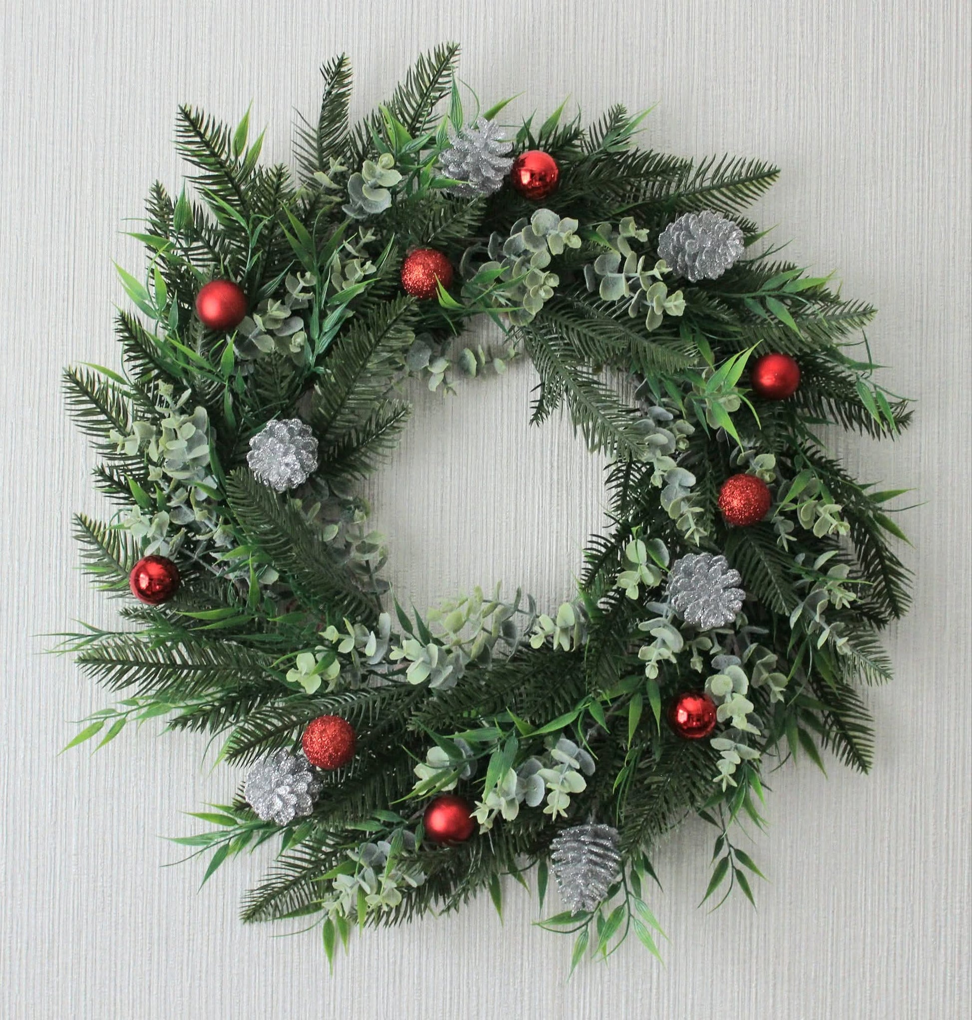Shimmering glitter pine cones catch the light beautifully, while mini red baubles add a playful pop of festive color.