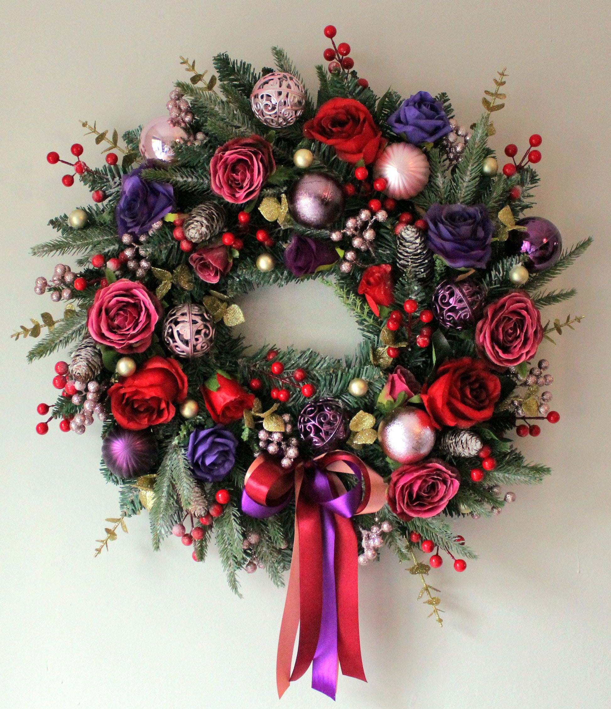With rich jewel-tones, dramatic plum/purple and pops of berry red. It brings a magical, Nutcracker-inspired vibe you won’t find in shop bought wreaths.