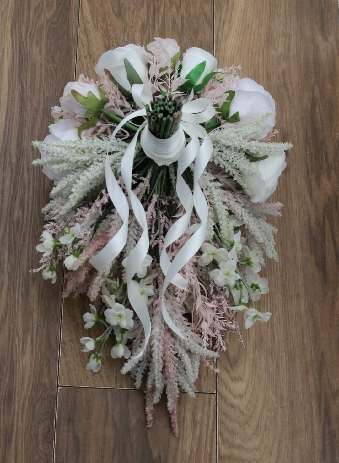 A romantic handmade bridal bouquet created using silk roses, astilbe, delphinium and gypsophilia