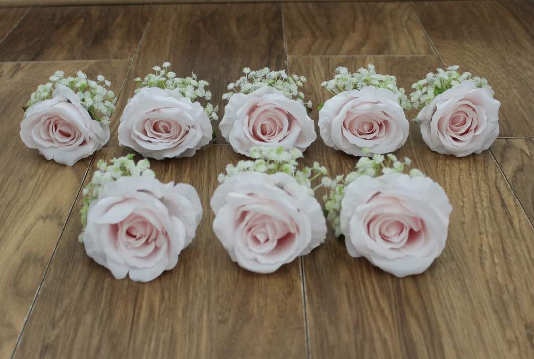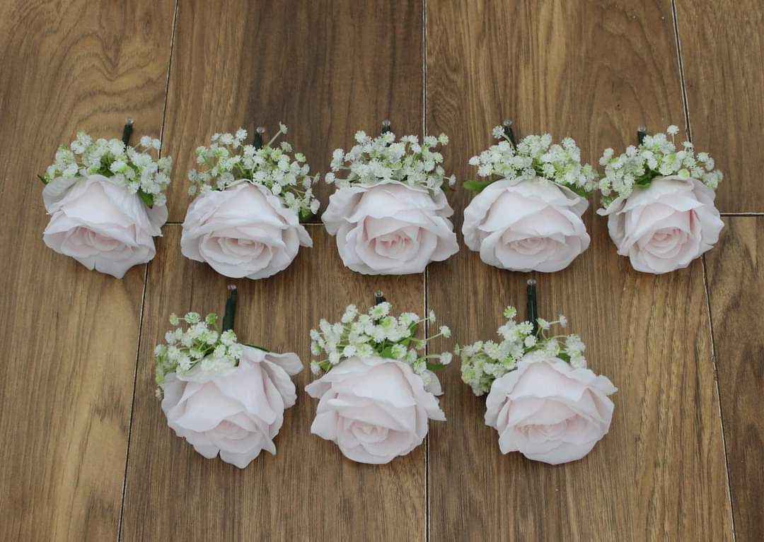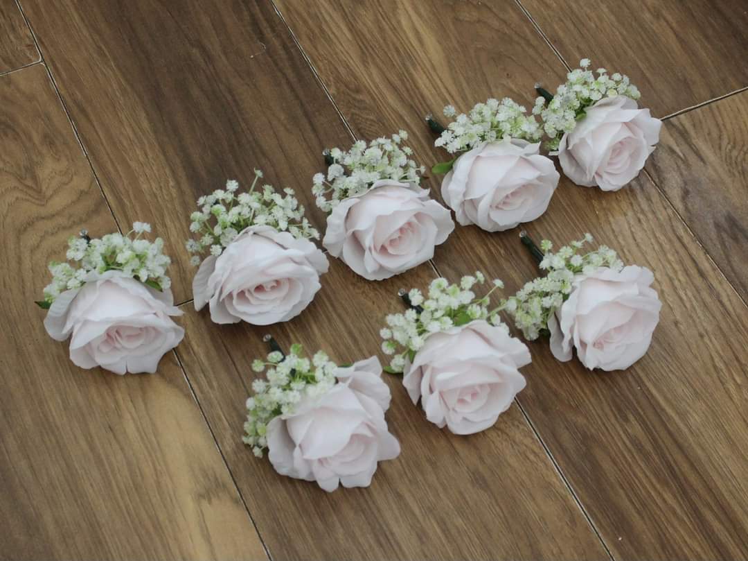 Open rose buttonhole contains a pale pink open rose and gypsophilia