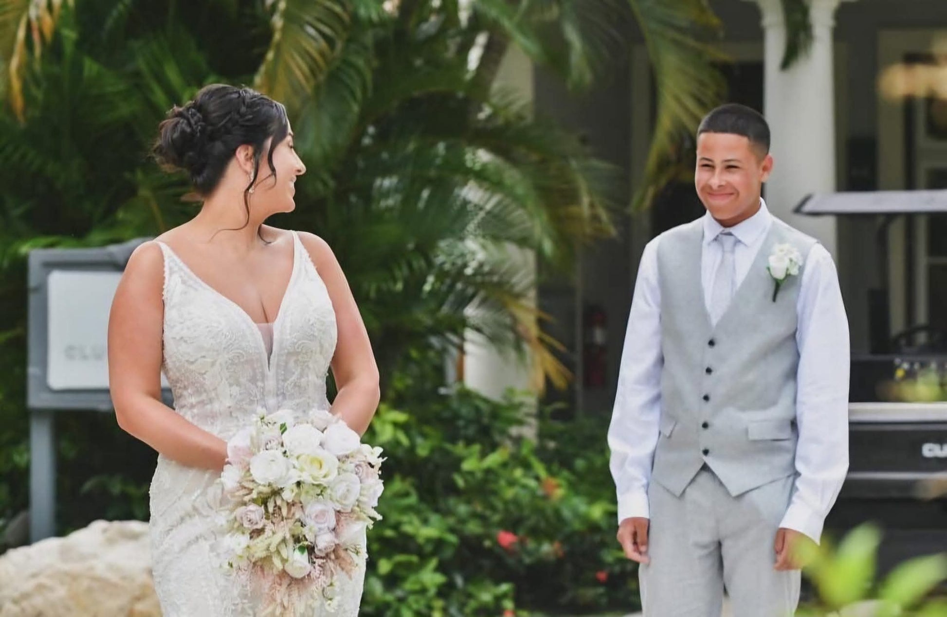 Rosebud buttonhole contains an ivory rosebud with delphinum and gypsophilia