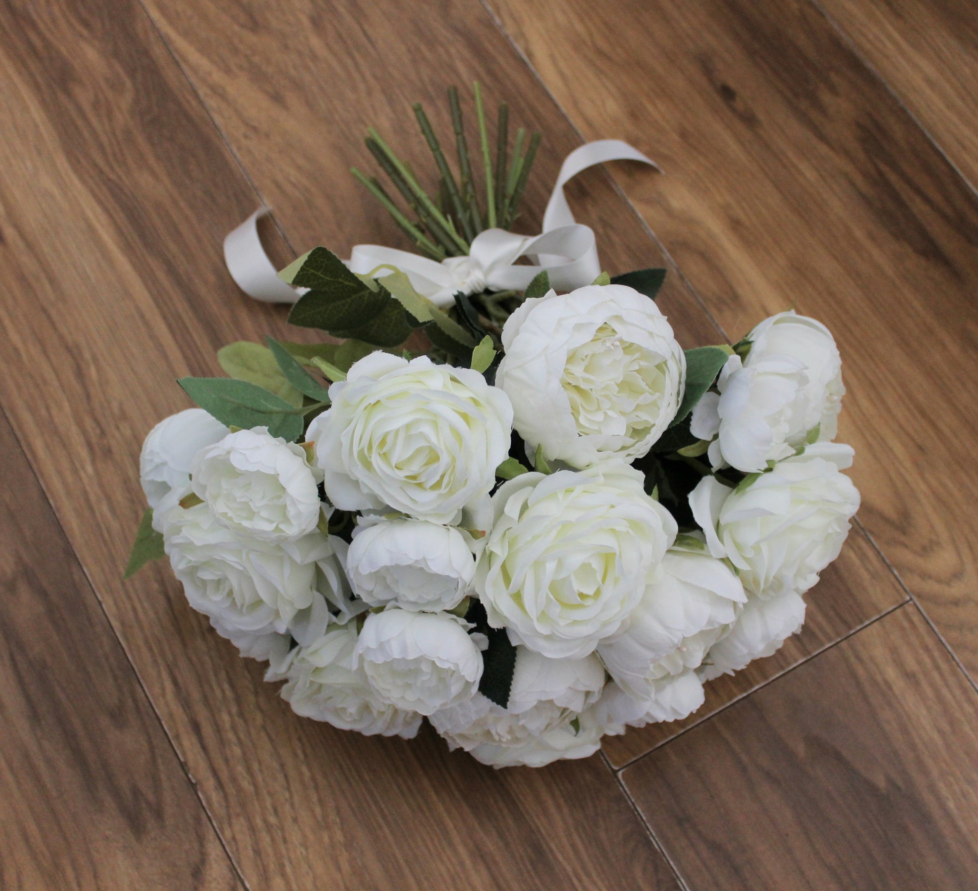 A hand tied bridal bouquet created using the spiral technique, contains very high grade long stem single stem silk roses and peonies in ivory