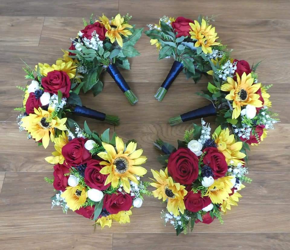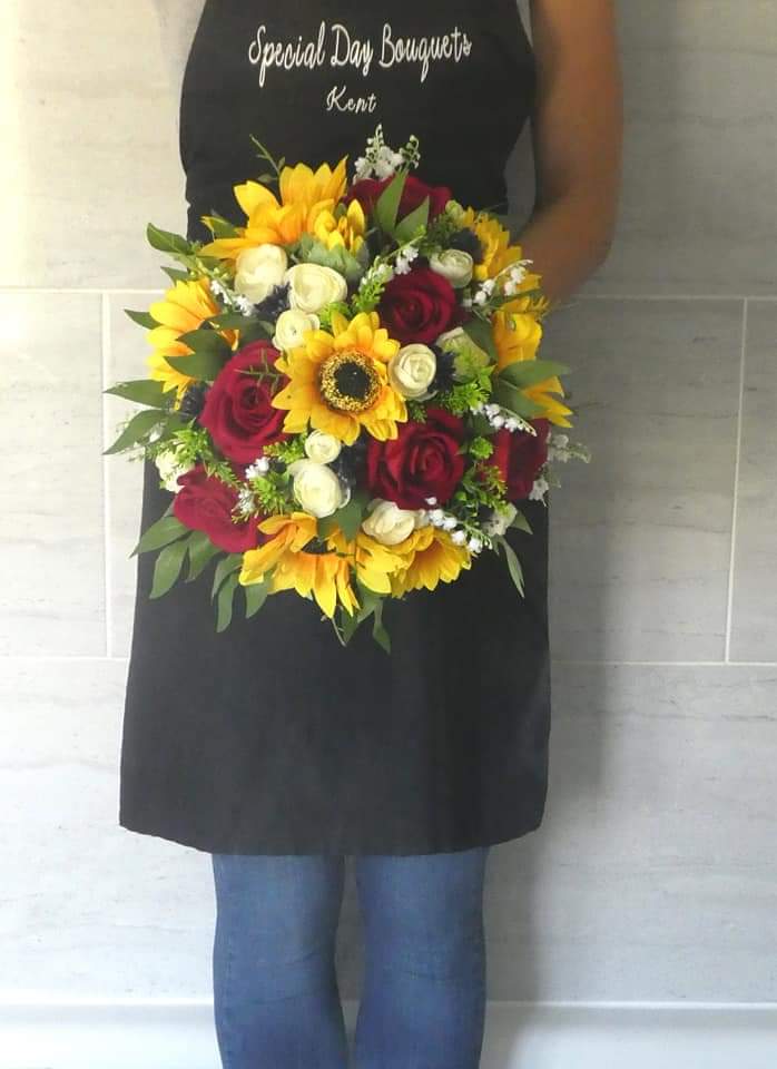 A beautiful handmade bridal bouquet created using single stem silk sunflowers, roses, ranunculus, lily of the valley, astilbe, willow leaves and pearlised babies breath.