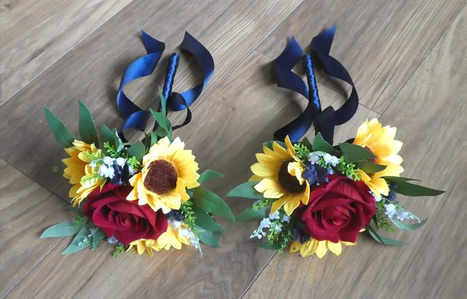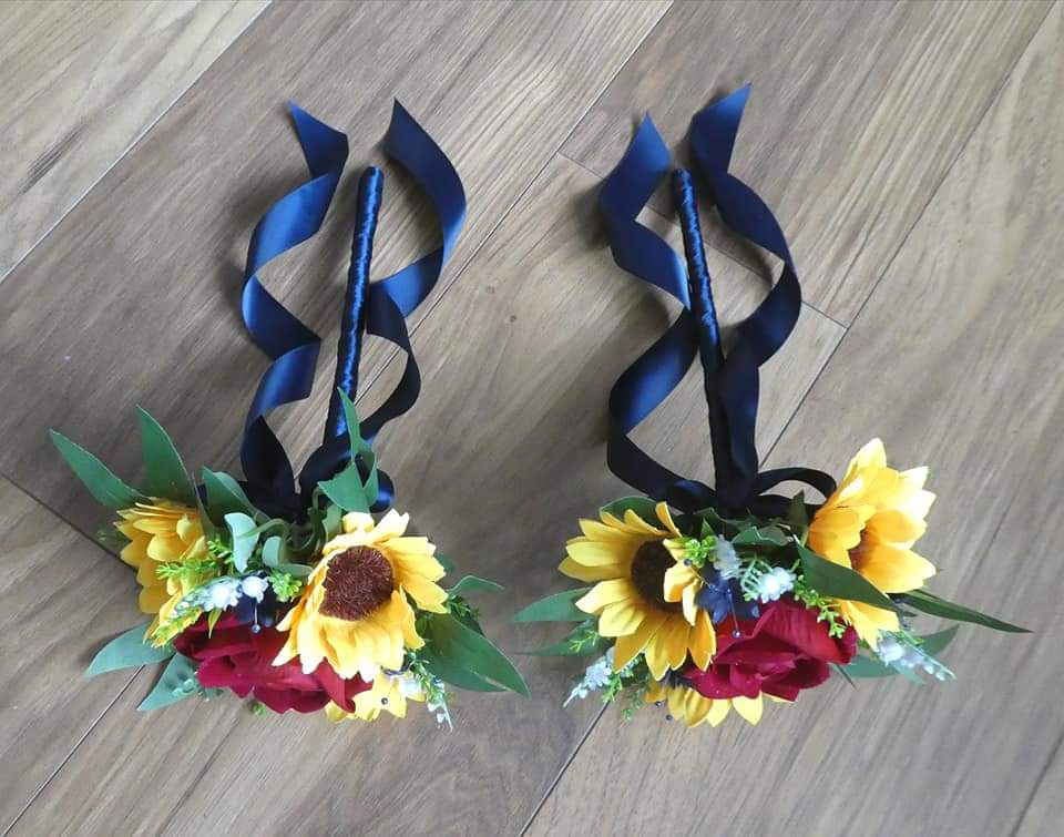 A beautiful handmade flower girl wand created using silk sunflowers, a rose, lily of the valley, astilbe, willow leaves and pearlised babies breath.