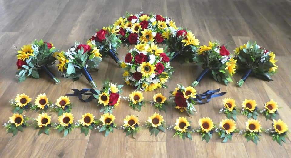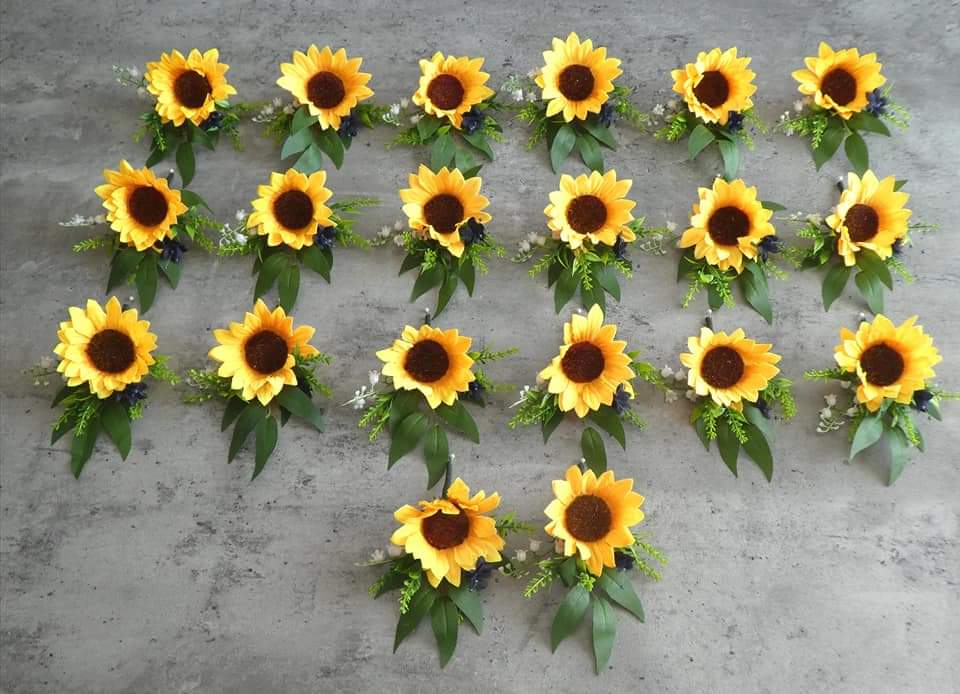 A beautiful handmade buttonhole created using a silk sunflower, lily of the valley, astilbe, willow leaves and pearlised babies breath