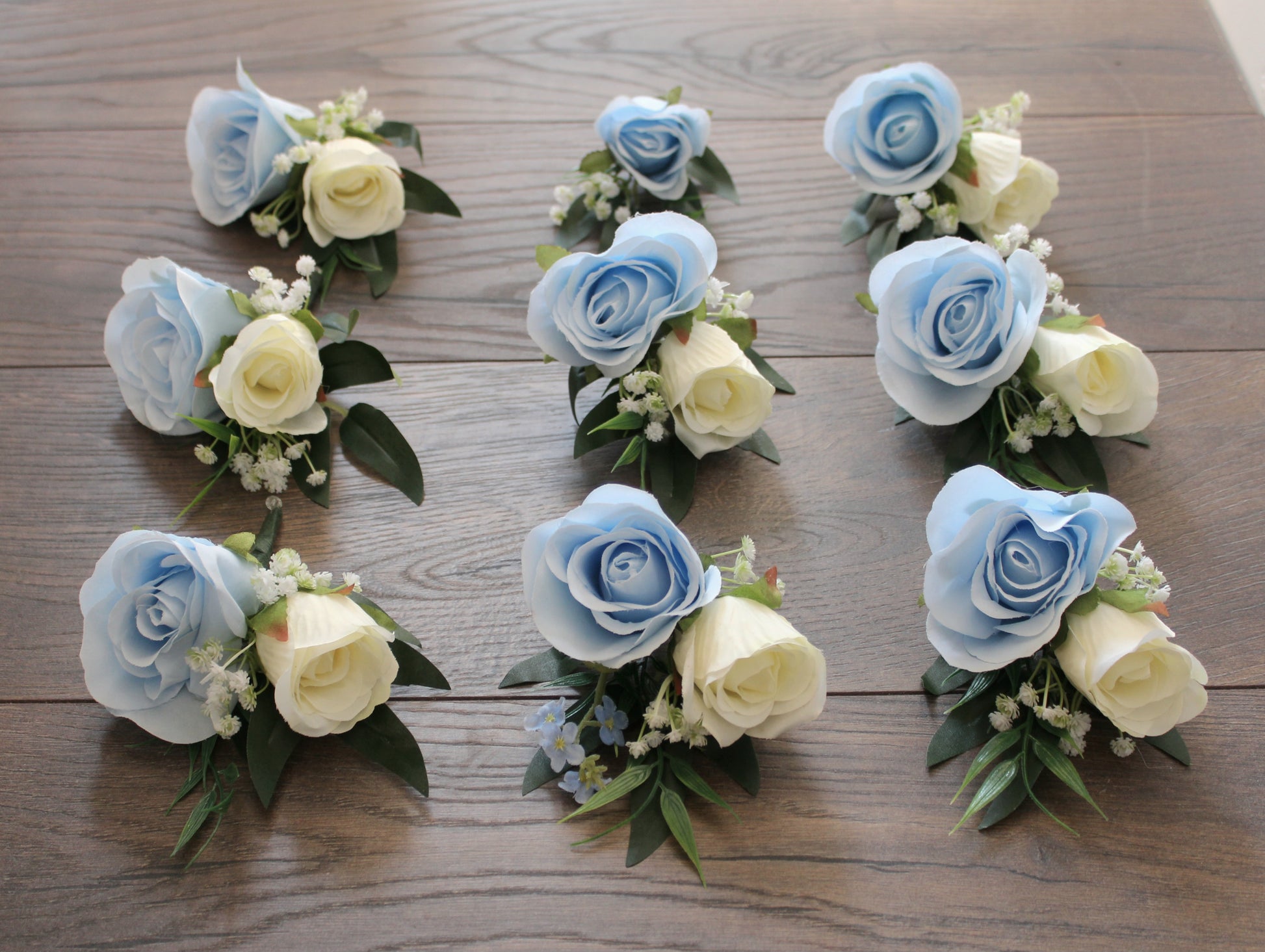 These gorgeous buttonholes contain very high grade single stem silk roses, bamboo leaves, willow leaves, gypsophilia and forget me nots