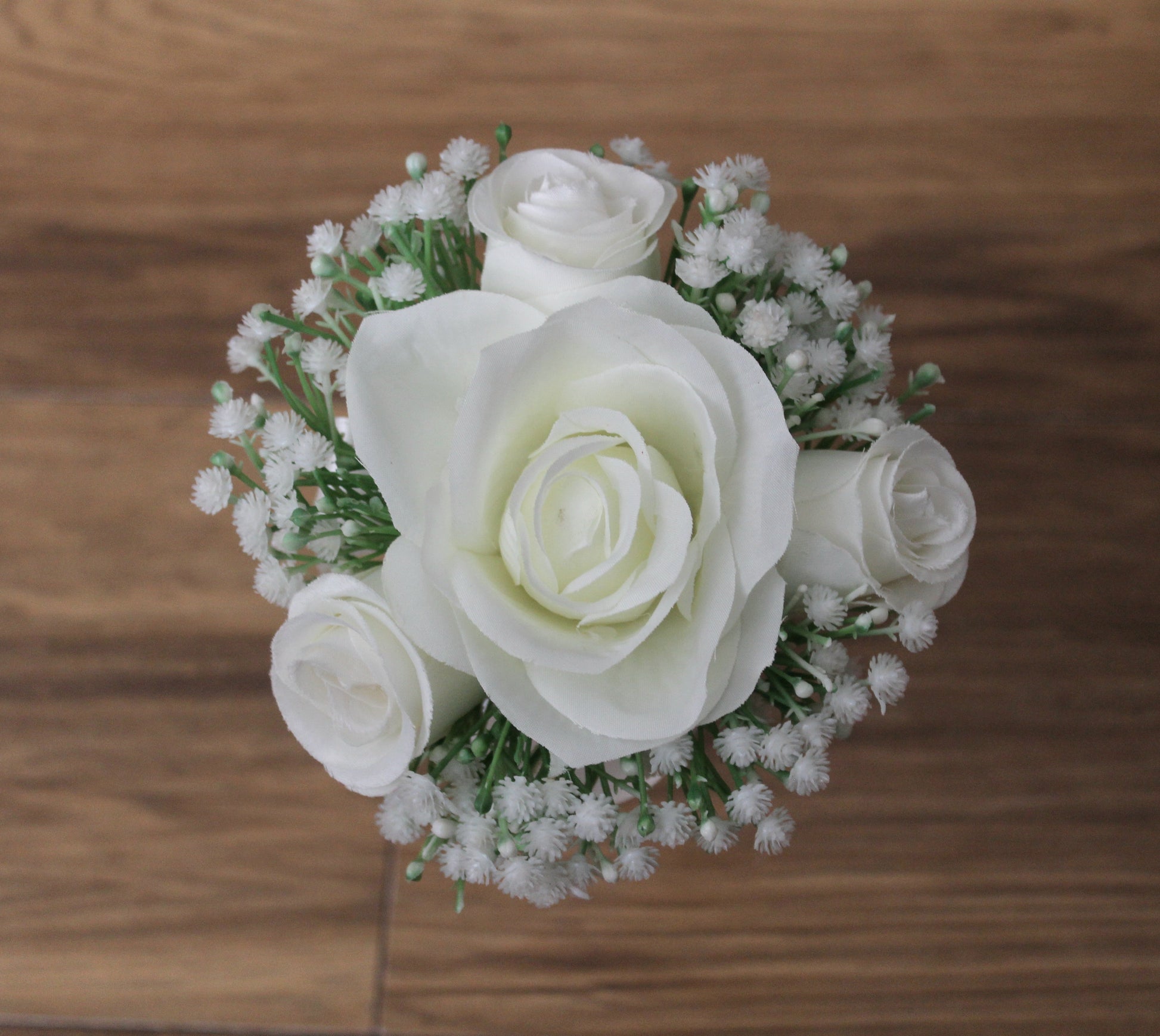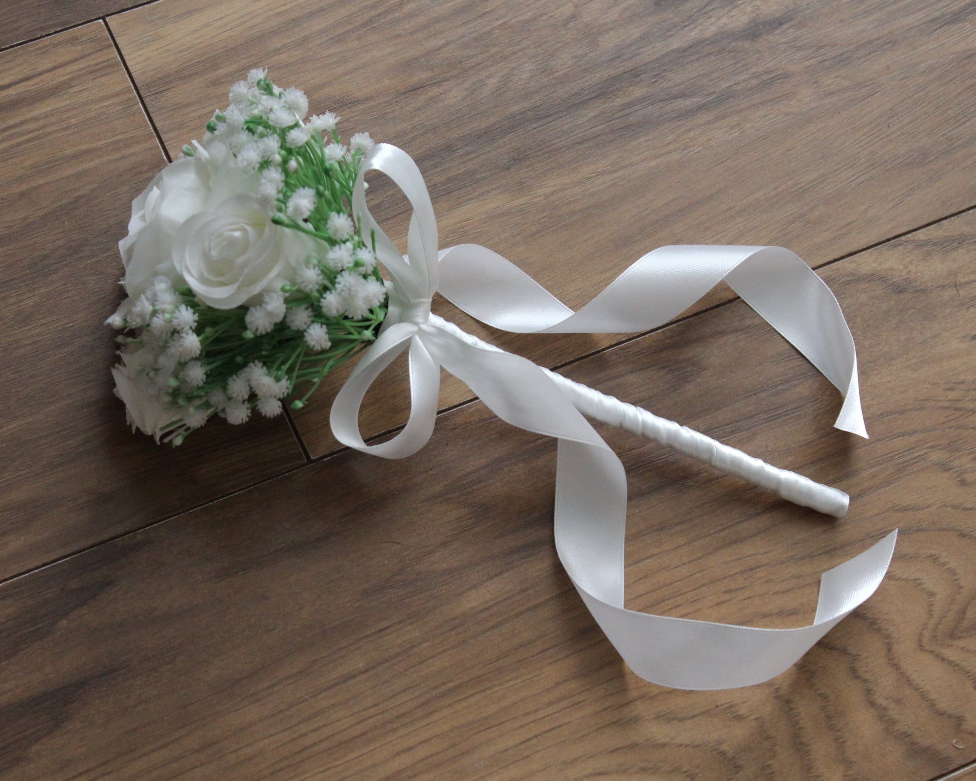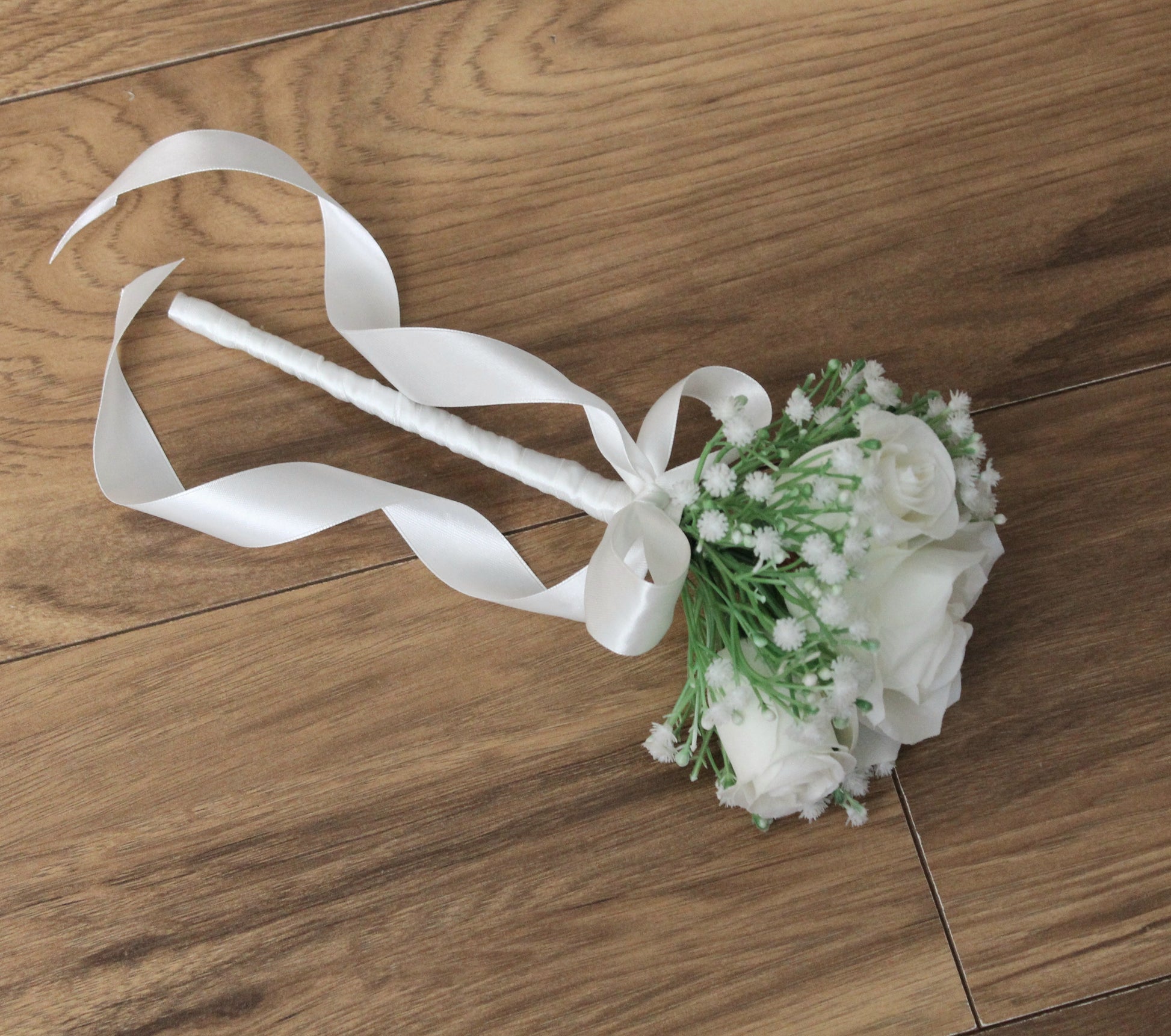 A timeless classic wedding accessory. Gypsophilia and rose flower girl wand created using artificial gypsophilia and roses.