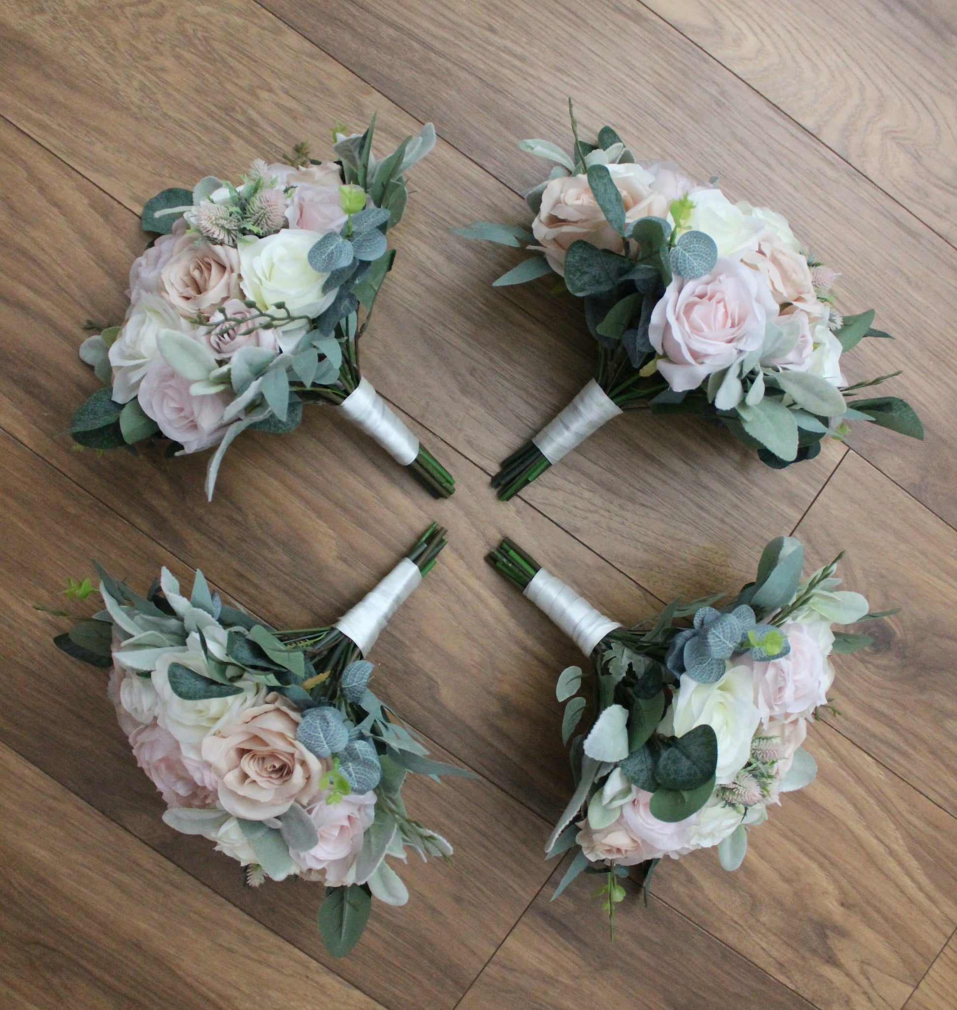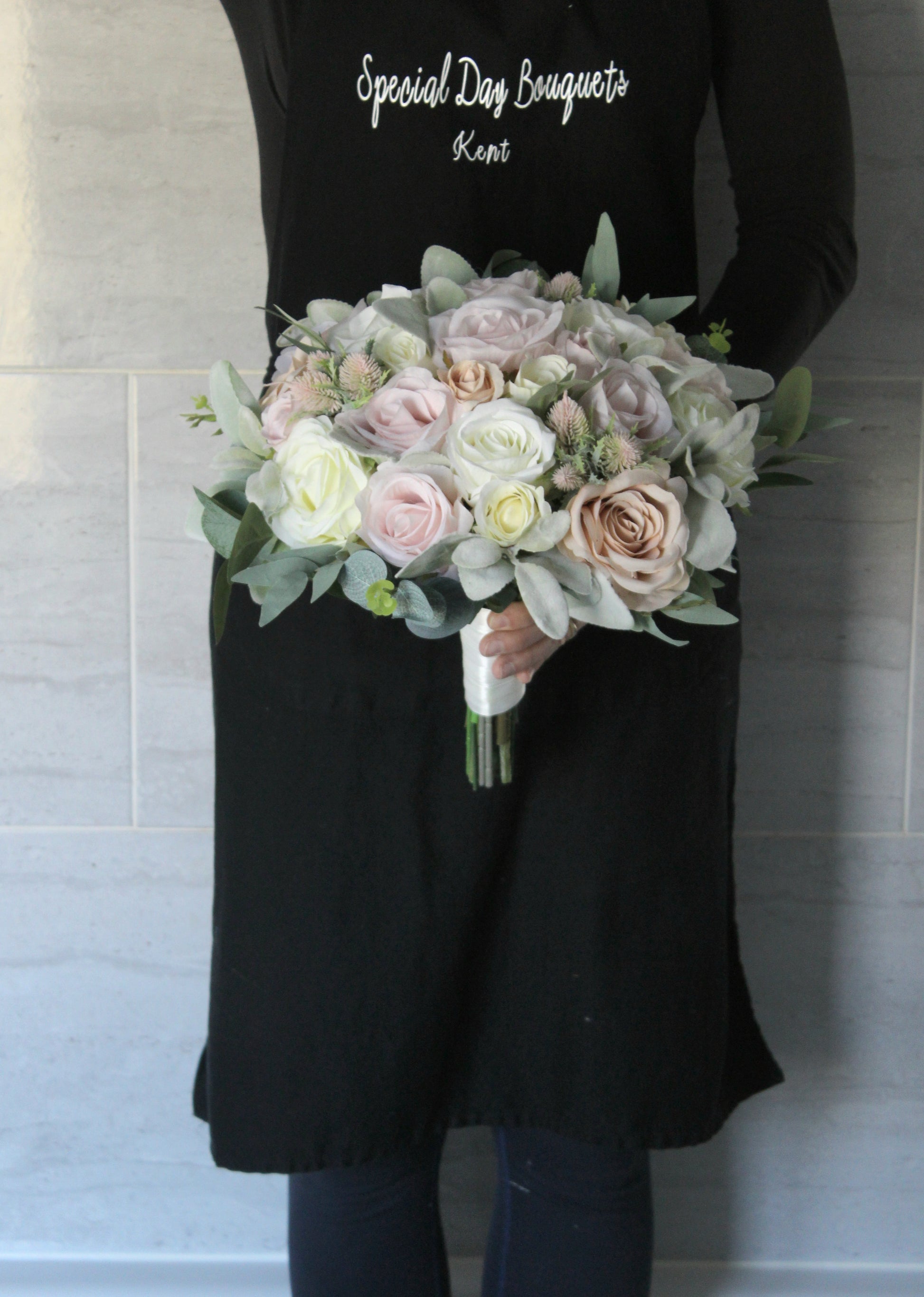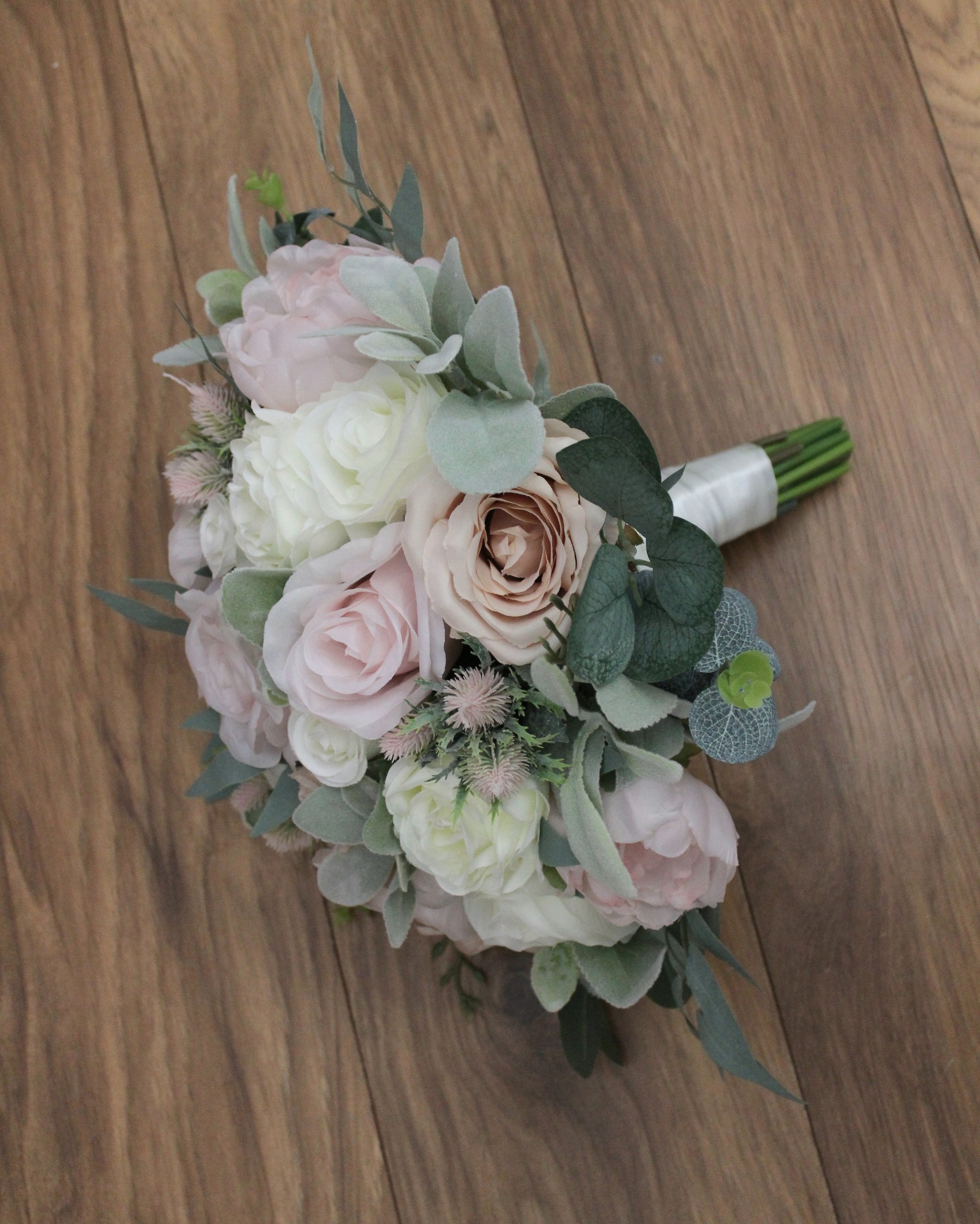 A beautiful handmade bridal bouquet created using silk roses, thistles, peonies, lambs ear leaves, eucalyptus and willow leaves