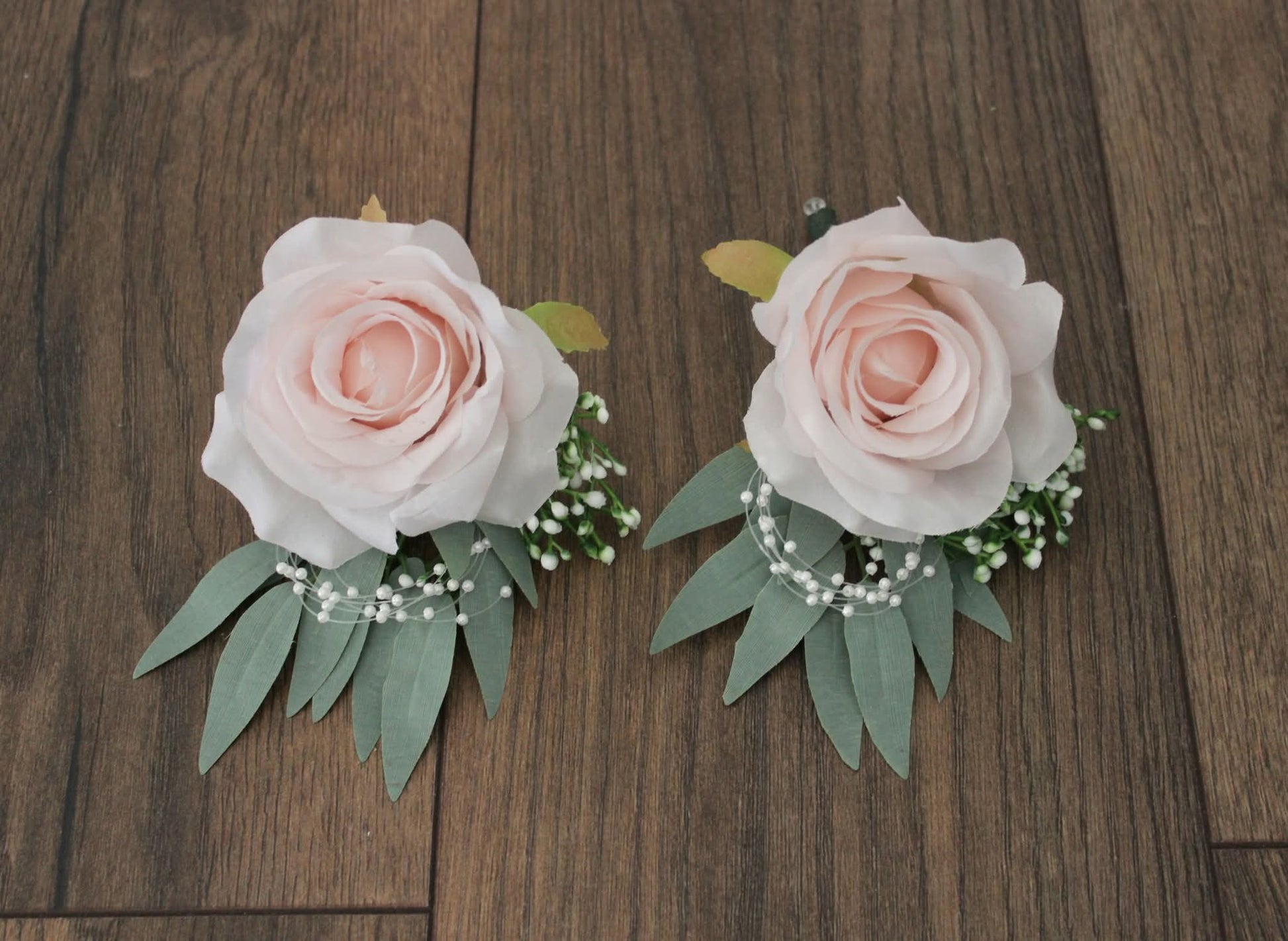 These gorgeous pin on corsages contain a very high grade single stem silk rose, gypsophilia, willow leaves and pearl loops