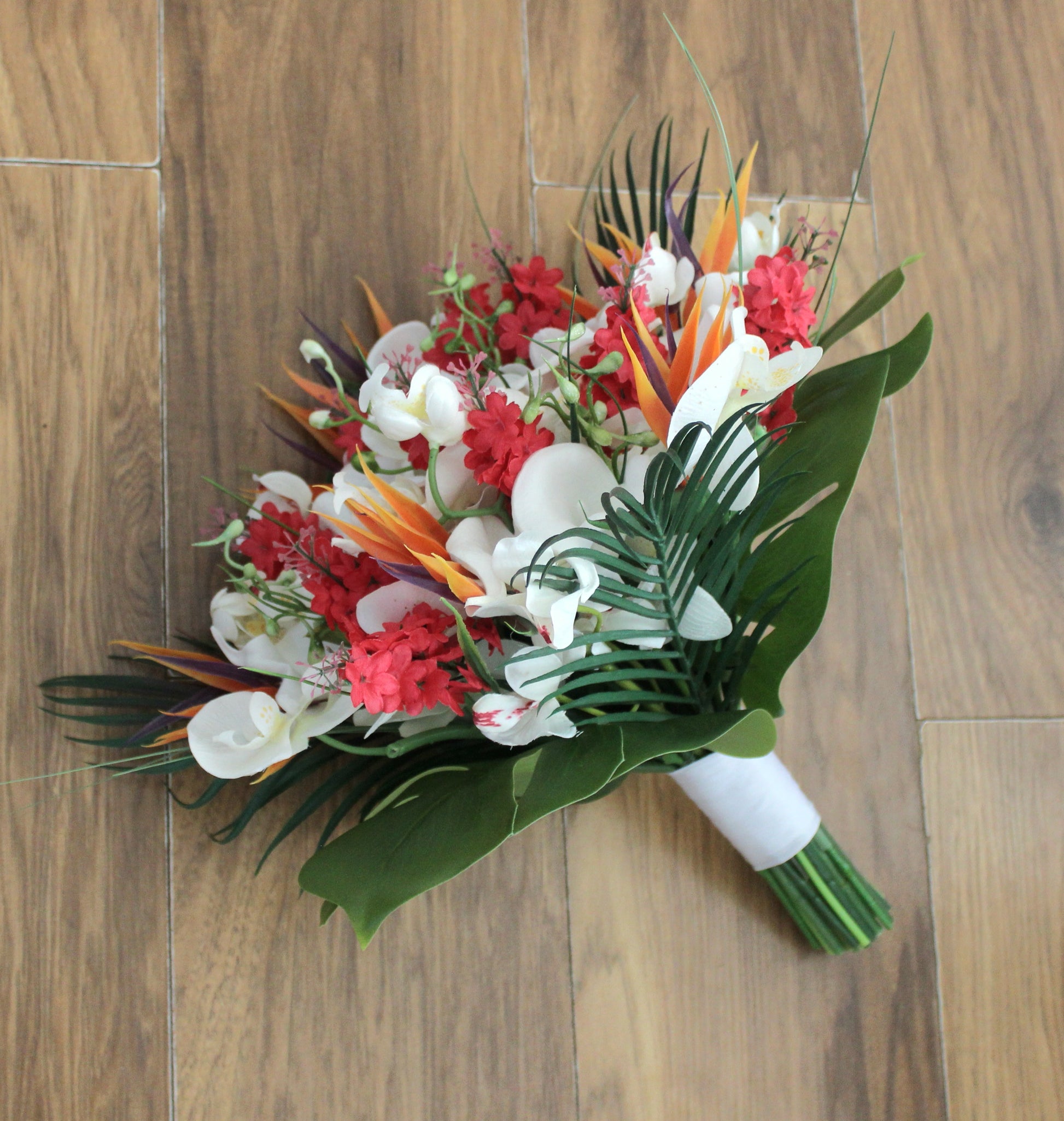 A beautiful tropical themed handmade bridal bouquet, ideal for a Caribbean wedding, created using very high grade single stem silk orchids, birds of paradise, calla lilies, monstera leaves, mini hyacinth, and palm leaves