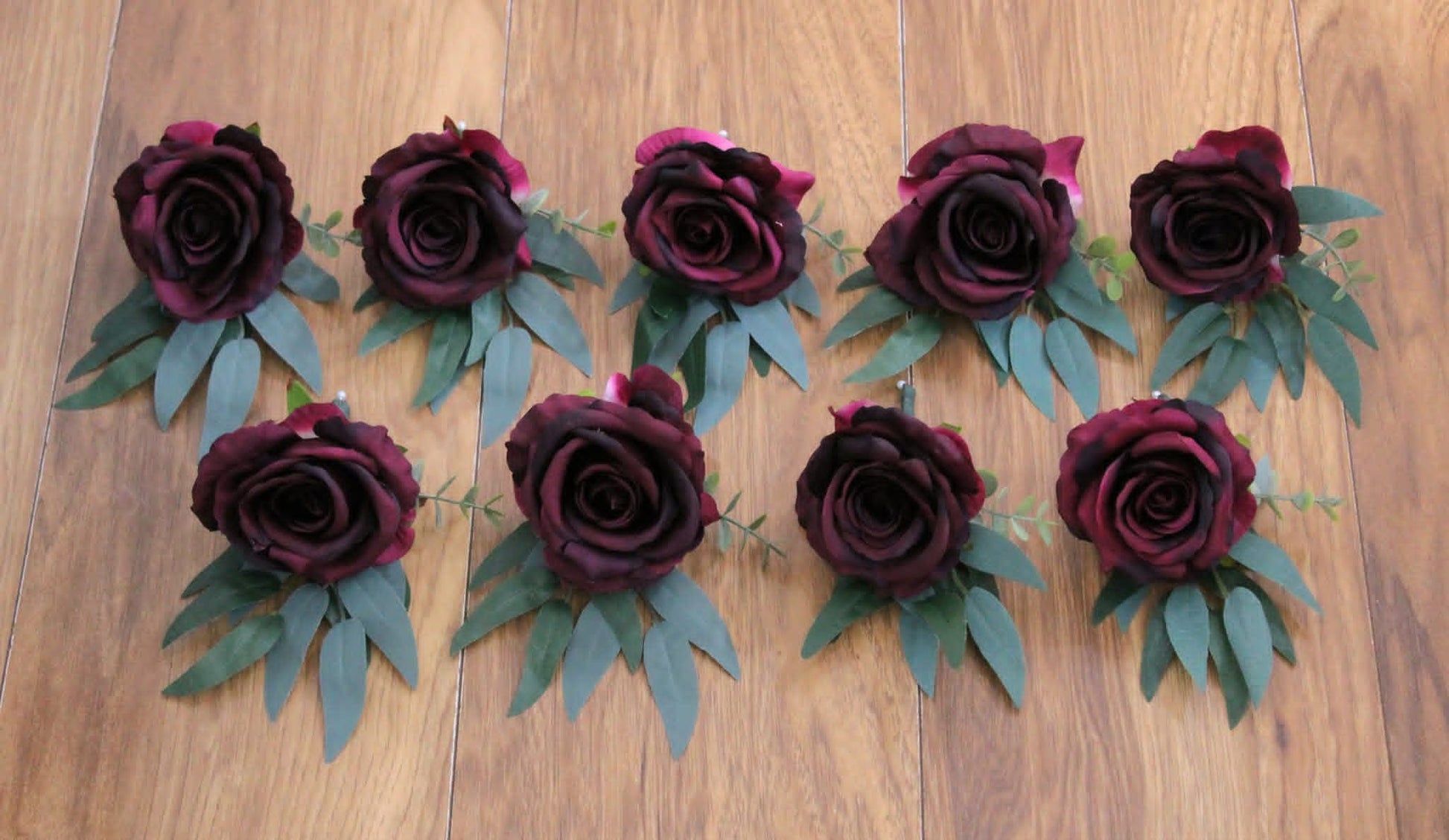 These beautiful buttonholes contain a very high grade single stem silk rose, eucalyptus and willow leaves.