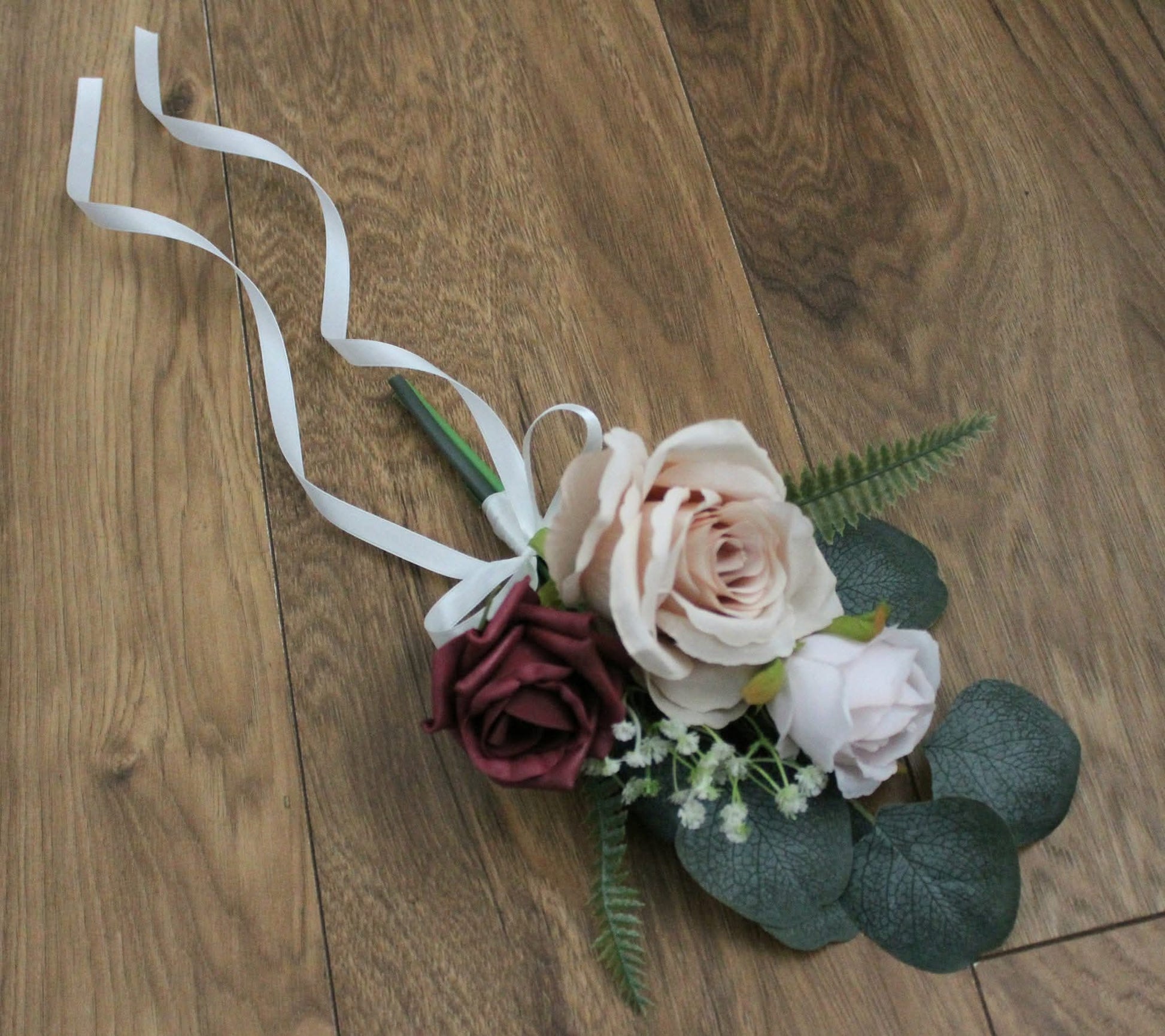Beautiful hand tied arrangements for pew ends or chairs. Created using very high grade single stem silk roses, eucalyptus, fern and gypsophila.