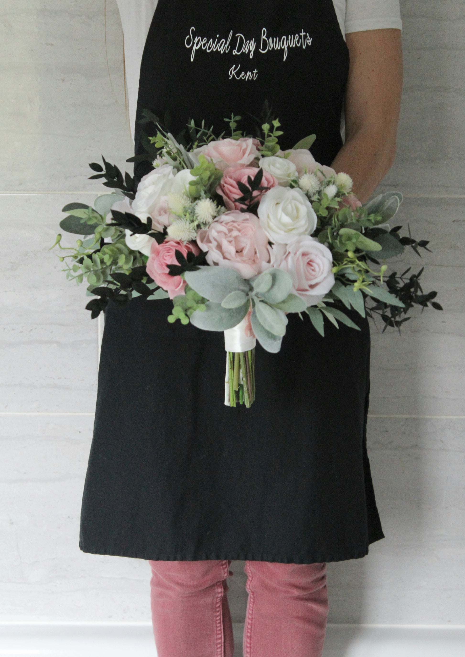 A Magnificent handmade bridal bouquet created using very high grade single stem silk roses, peonies, thistles, lambs ear, Delphinium, eucalyptus and dried eucalyptus.