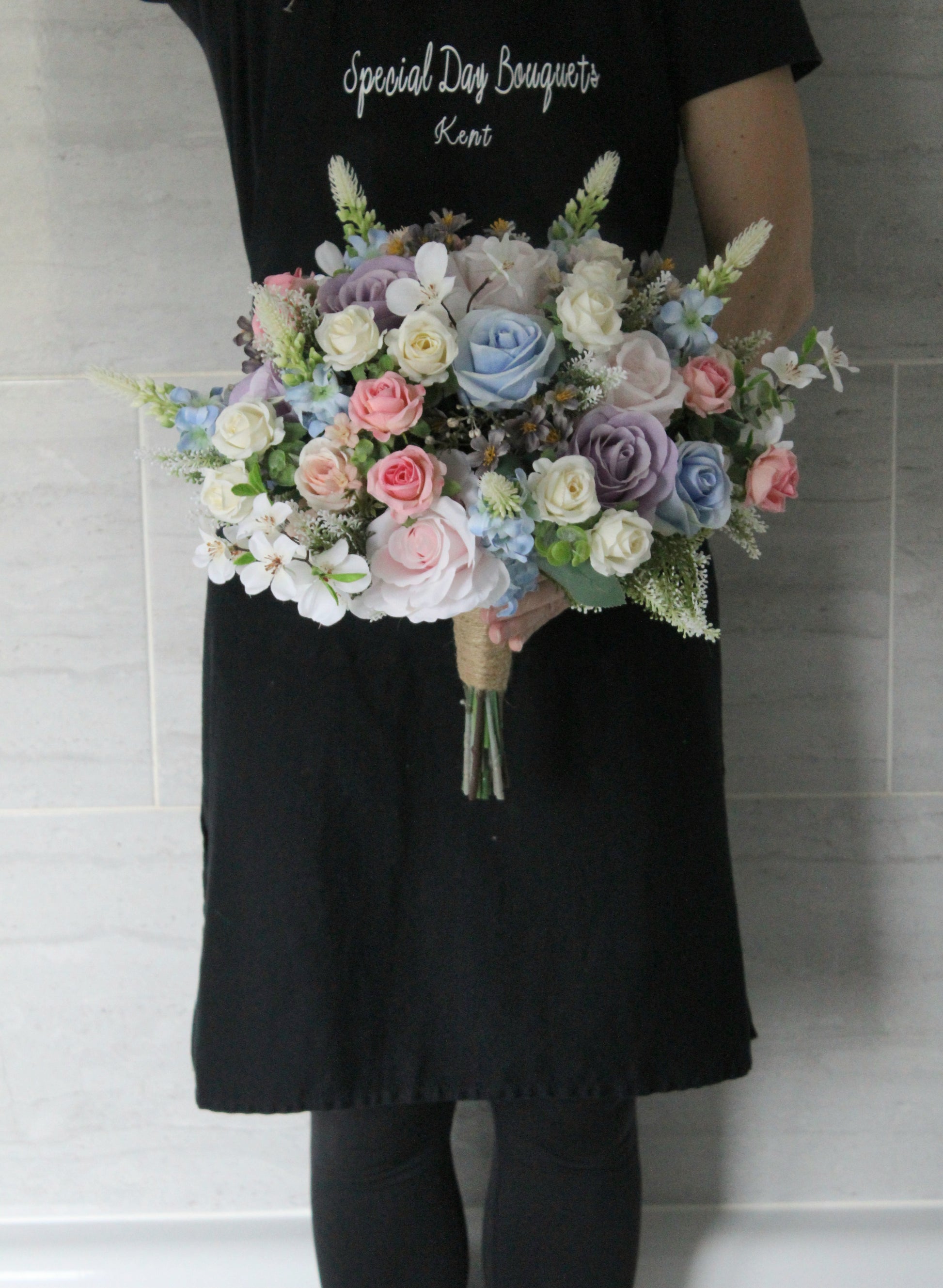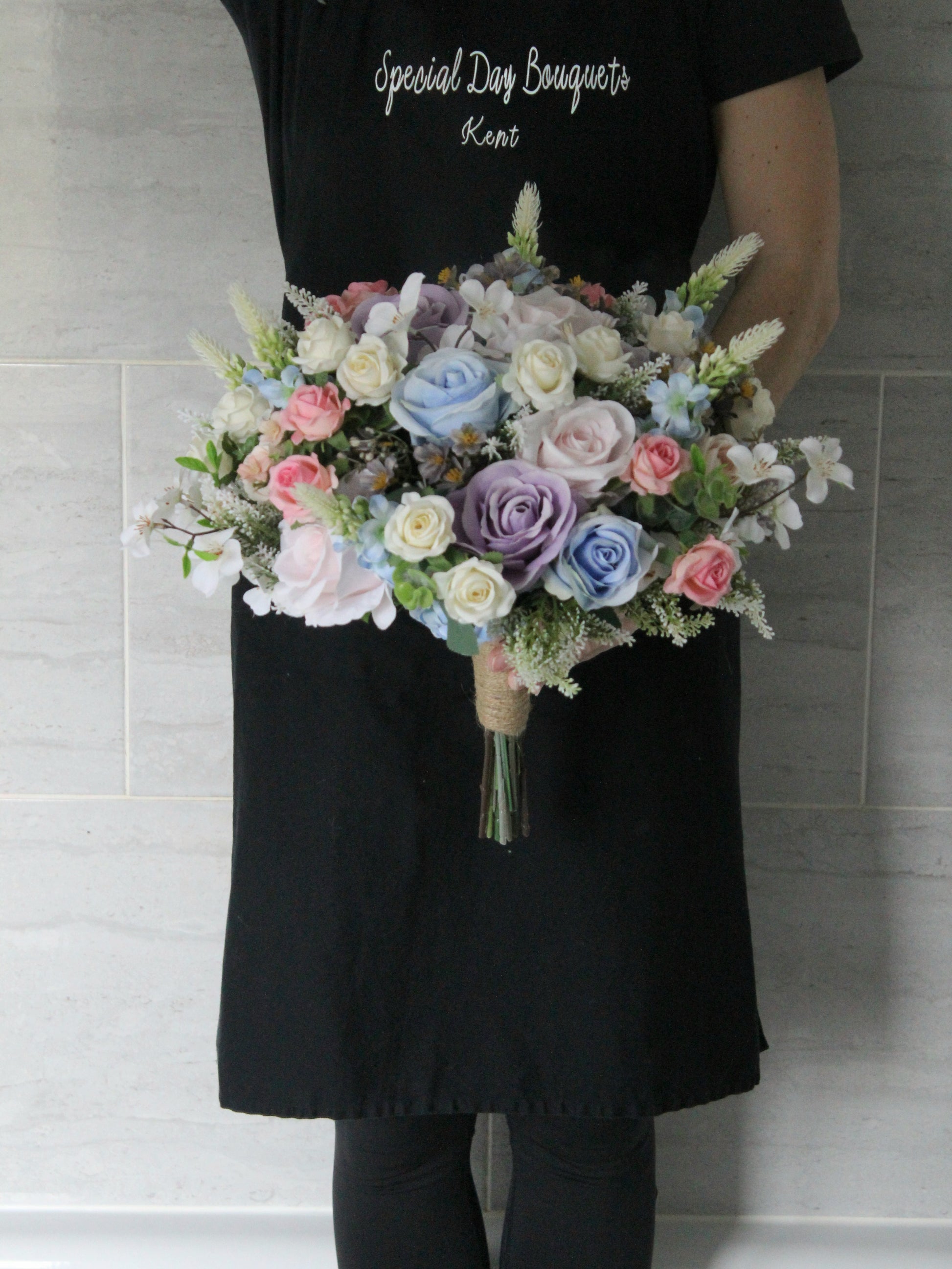 A beautiful handmade bridal bouquet created using silk roses, delphinium, astilbe, blossom, ranunculus, and daphne