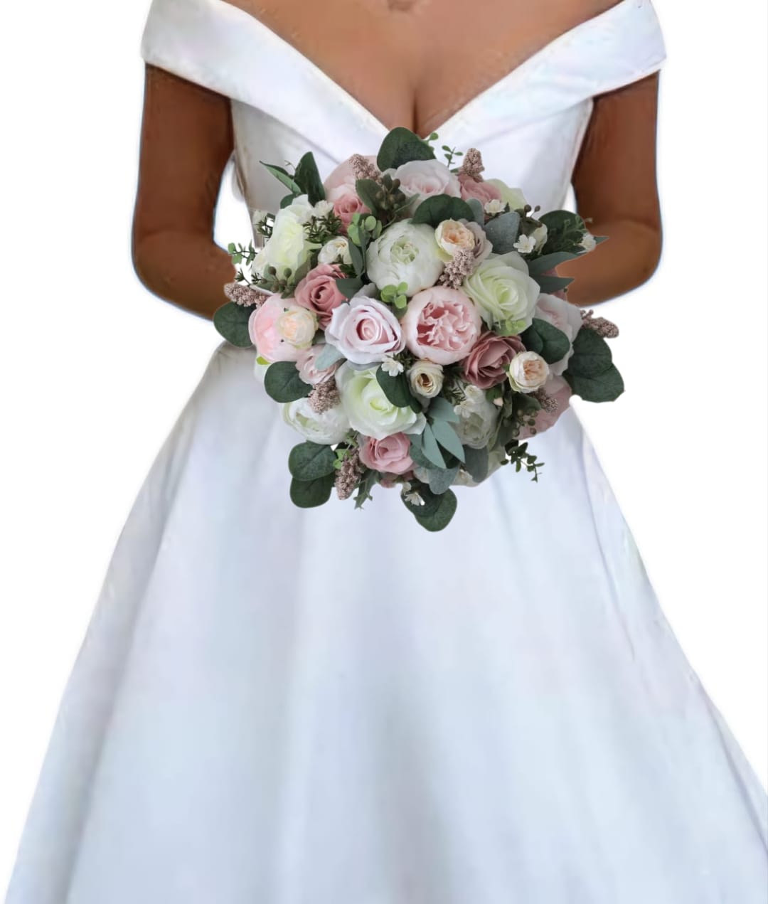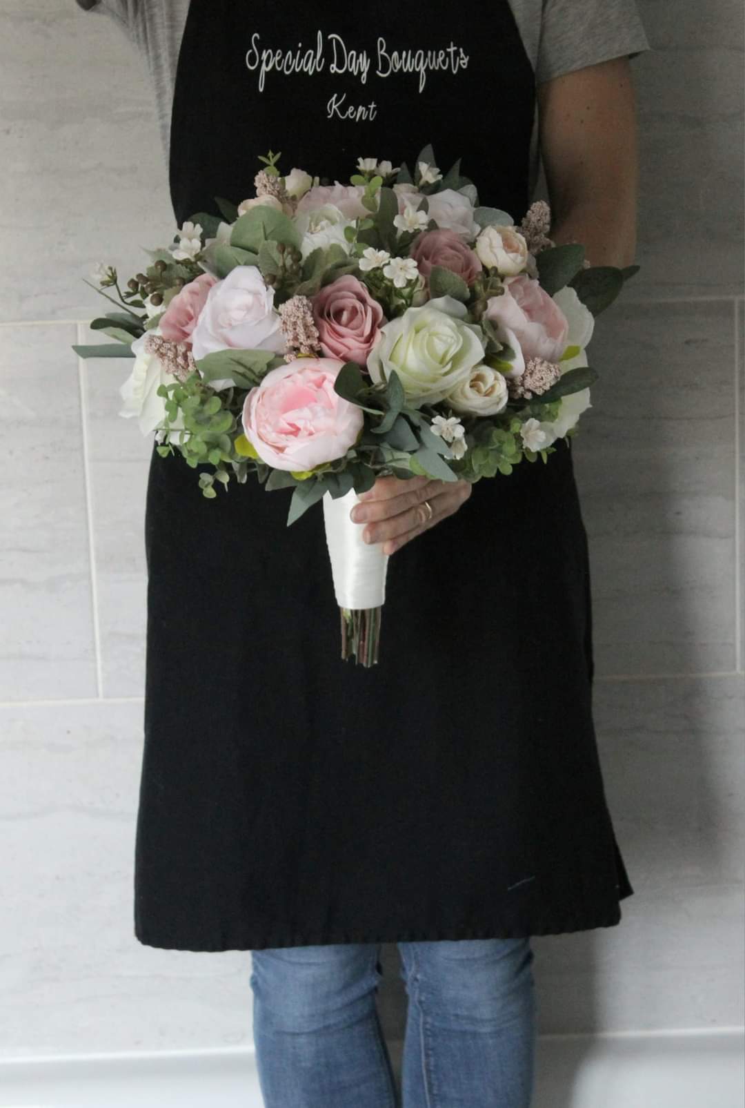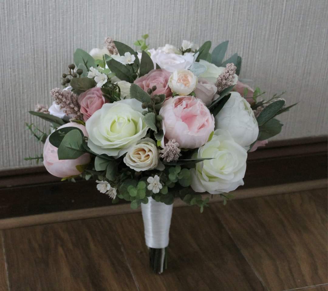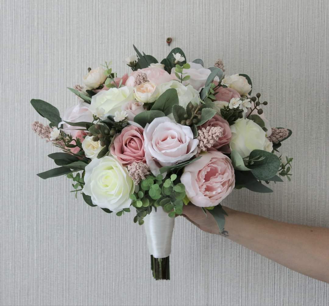 A beautiful handmade bridal bouquet created using silk roses, peonies, ranunculus, blossom, eucalyptus, astilbe, lambs ear leaves and wild berries.