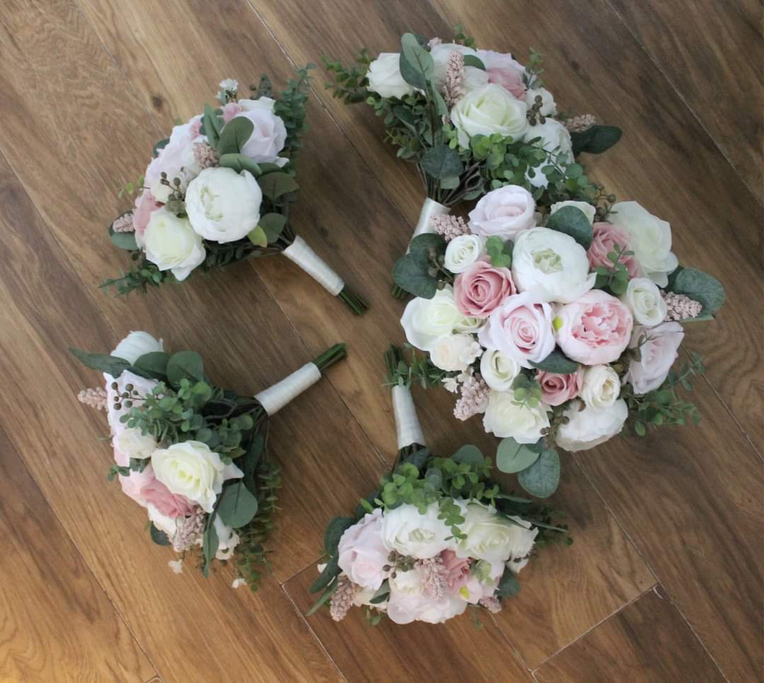 Photo shows pale pink, dusky pink, baby pink and ivory flowers with ivory ribbon.