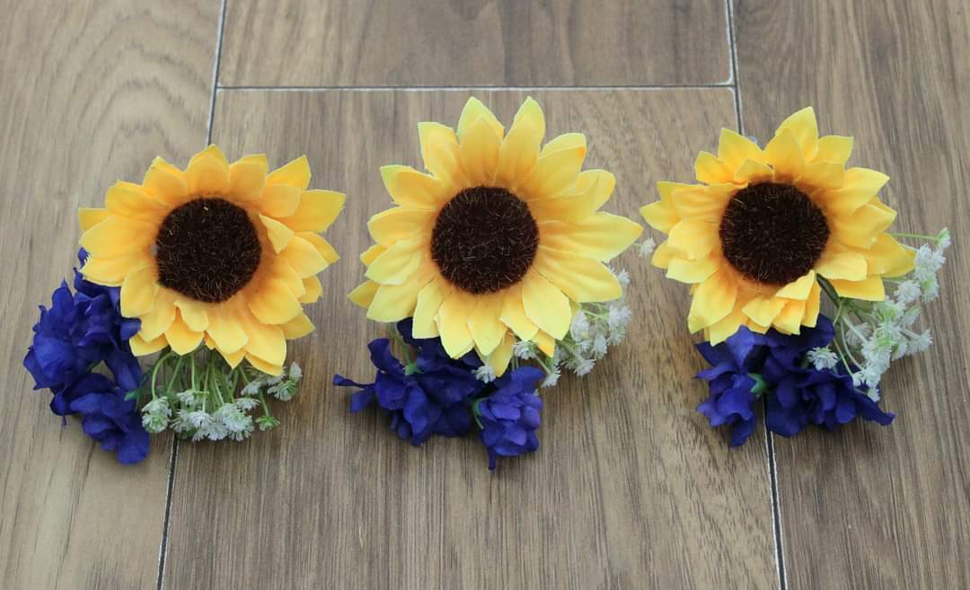 These stunning buttonholes contain a single stem silk sunflower, gypsophilia and delphinium.