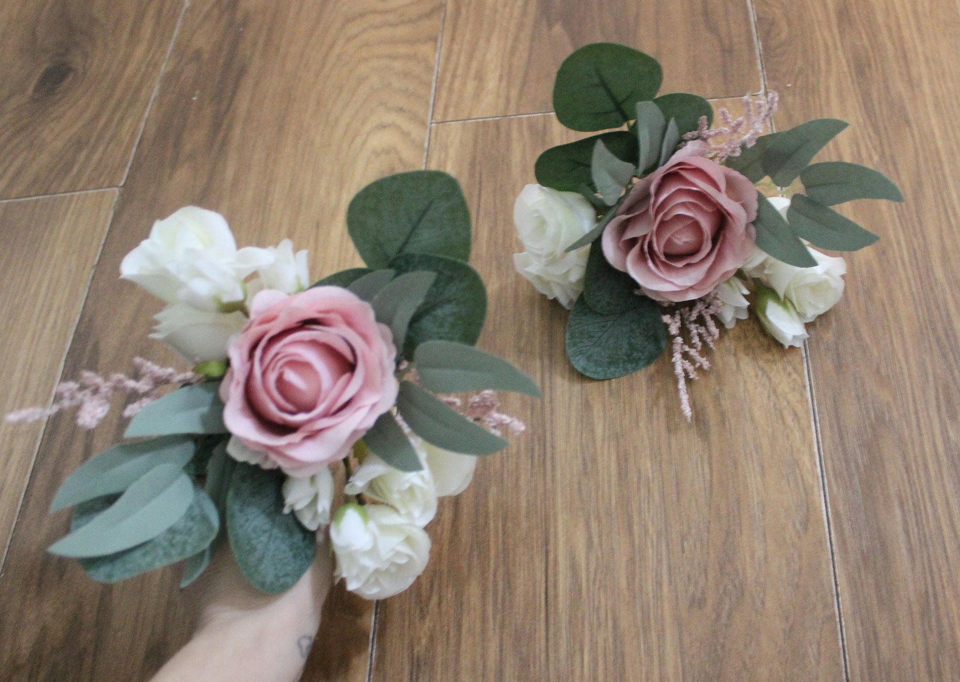 A Wonderful cake flower arrangement created using single stem silk roses, willow leaves, eucalyptus and astilbe