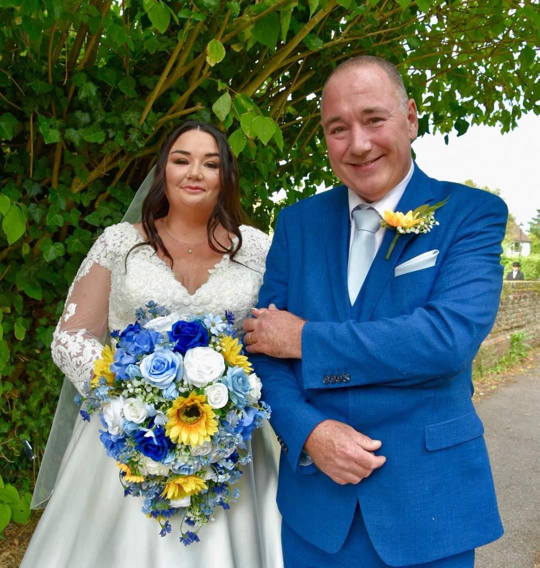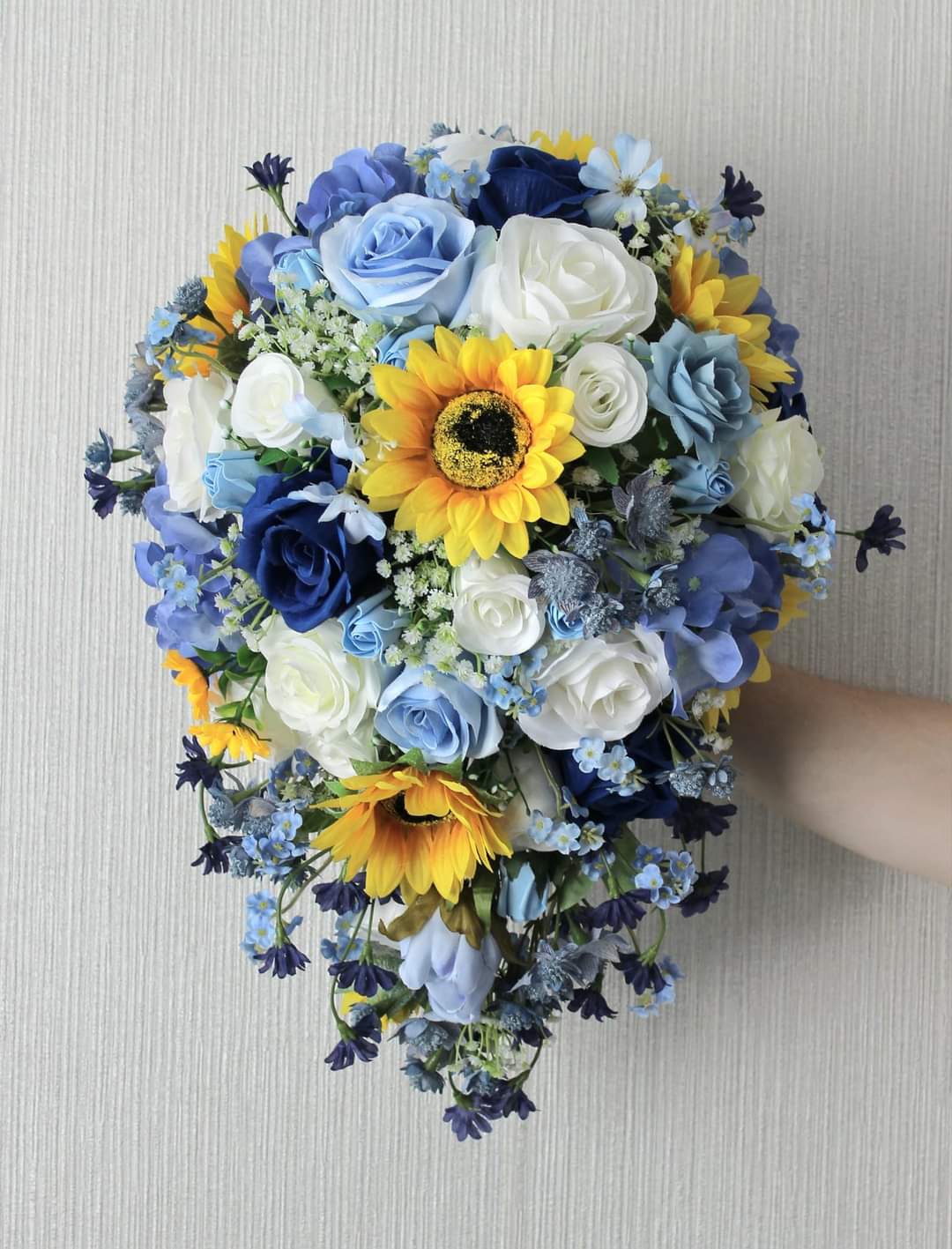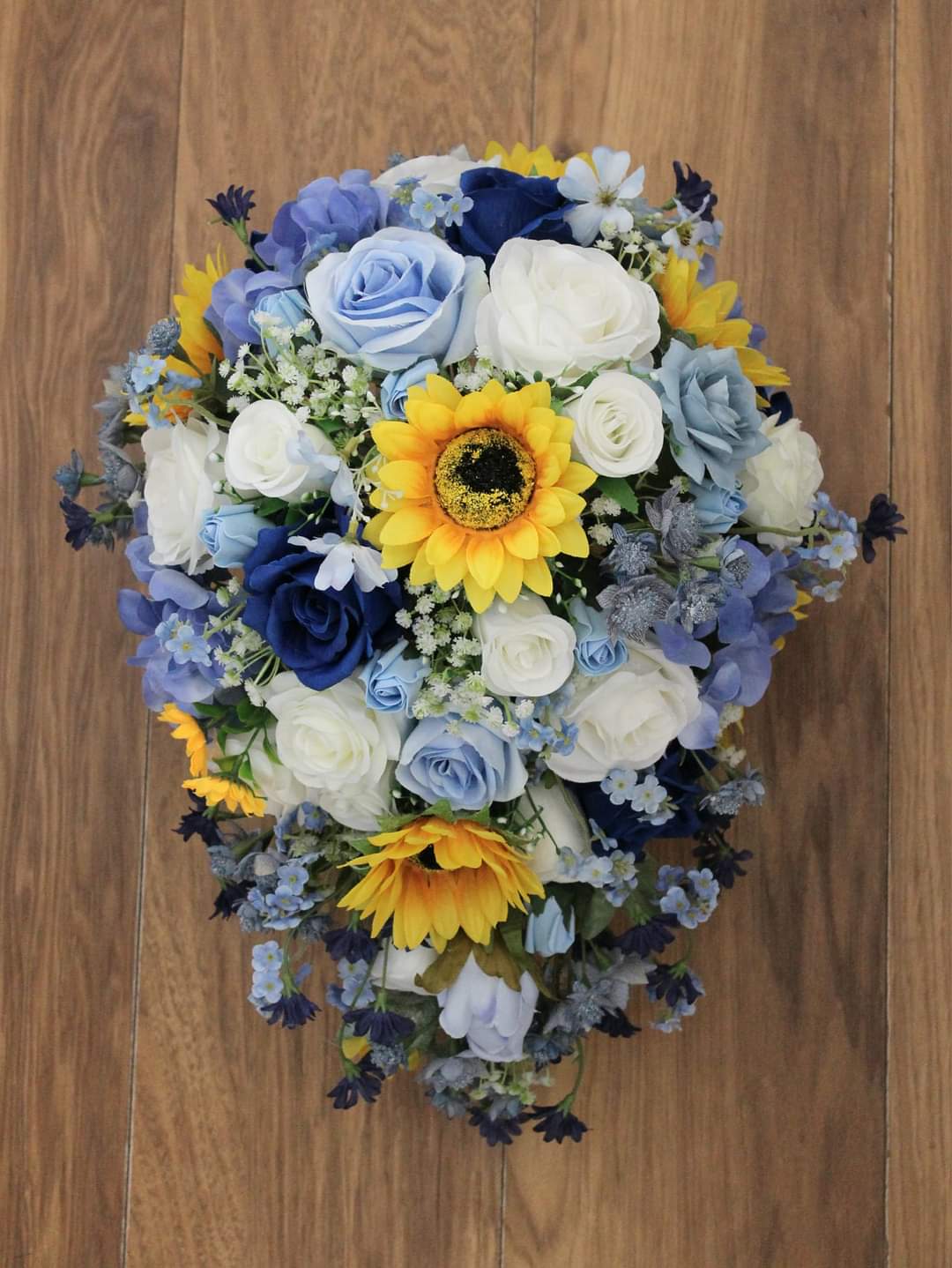 A gorgeous handmade bridal bouquet created using silk sunflowers, roses, forget me nots, wild daisies, gypsophilia, astrantia and hydrangea.