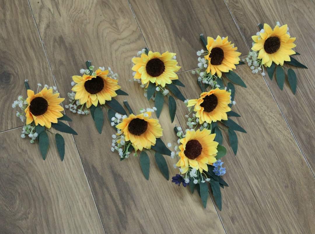 -Single sunflower buttonholes contains gypsophila, willow leaves and a sunflower.