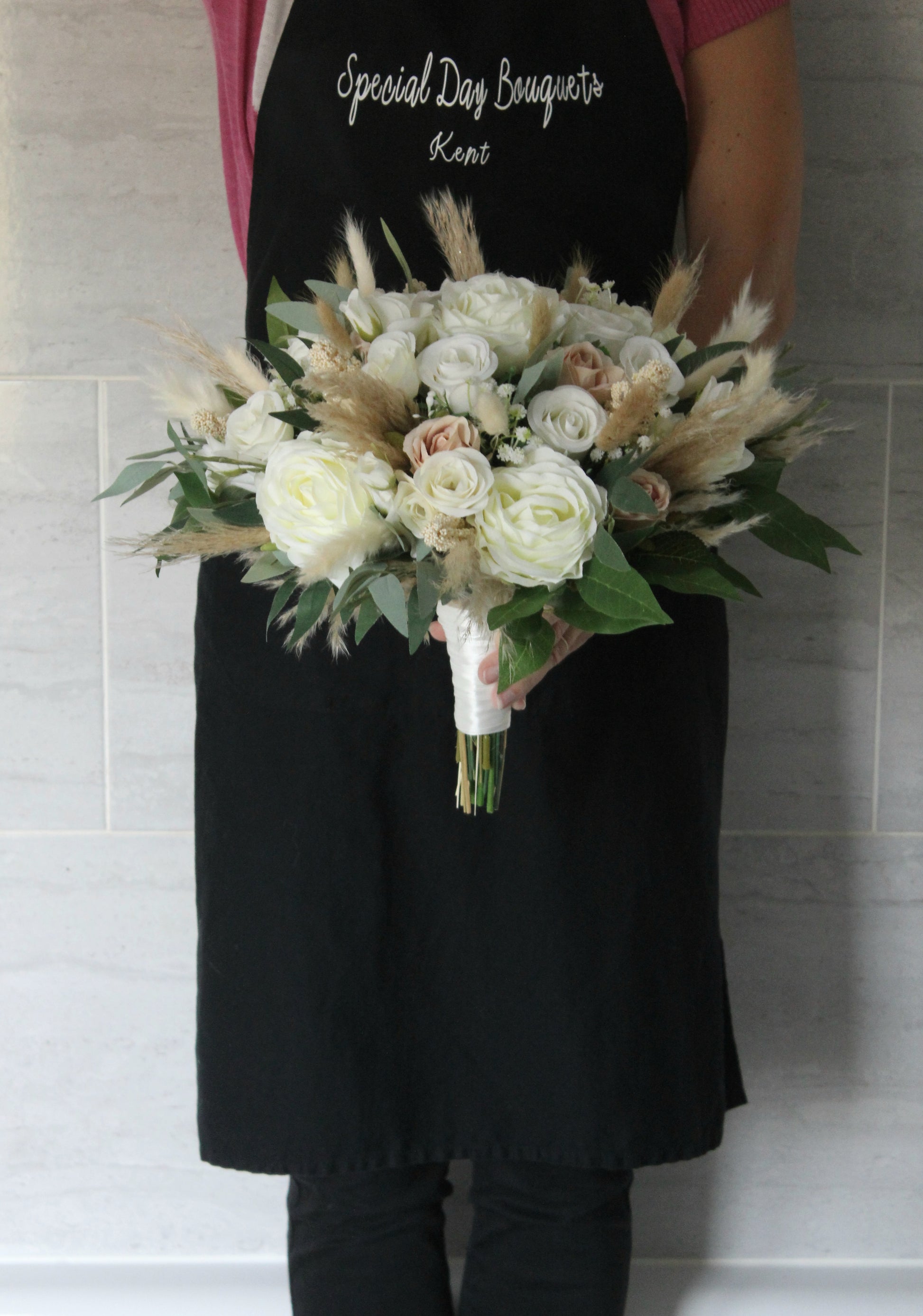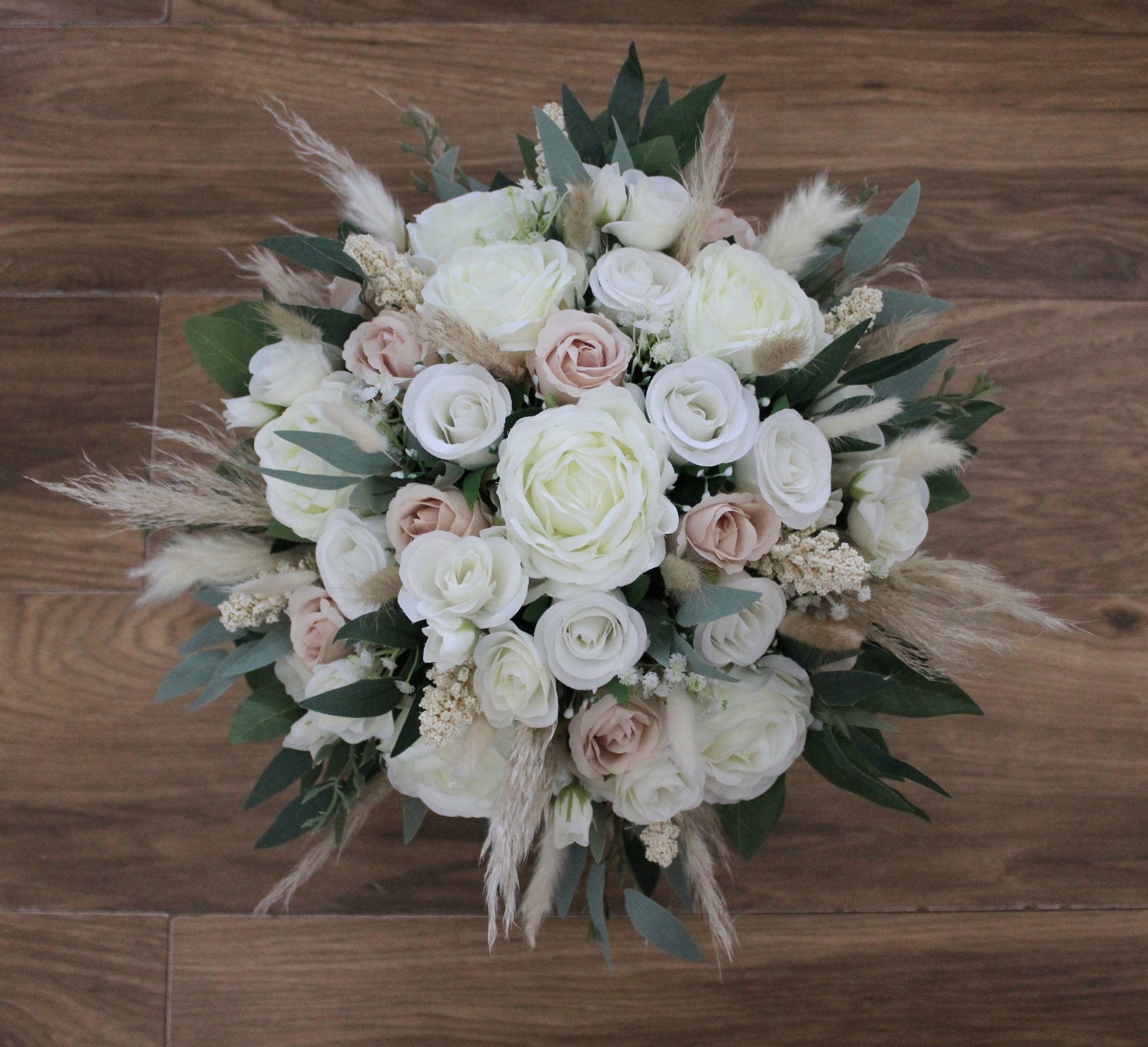 A Gorgeous handmade bridal bouquet created using very high grade single stem silk roses, eucalyptus, shakibi, willow leaves, gypsophilia, astilbe, dried bunny tails and dried pampas sprays