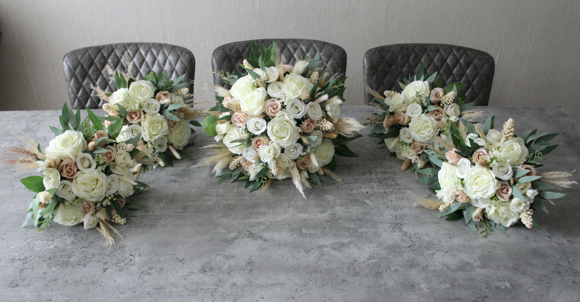 Photo shows Large Bridal Bouquet size and Junior Bridesmaid Bouquets