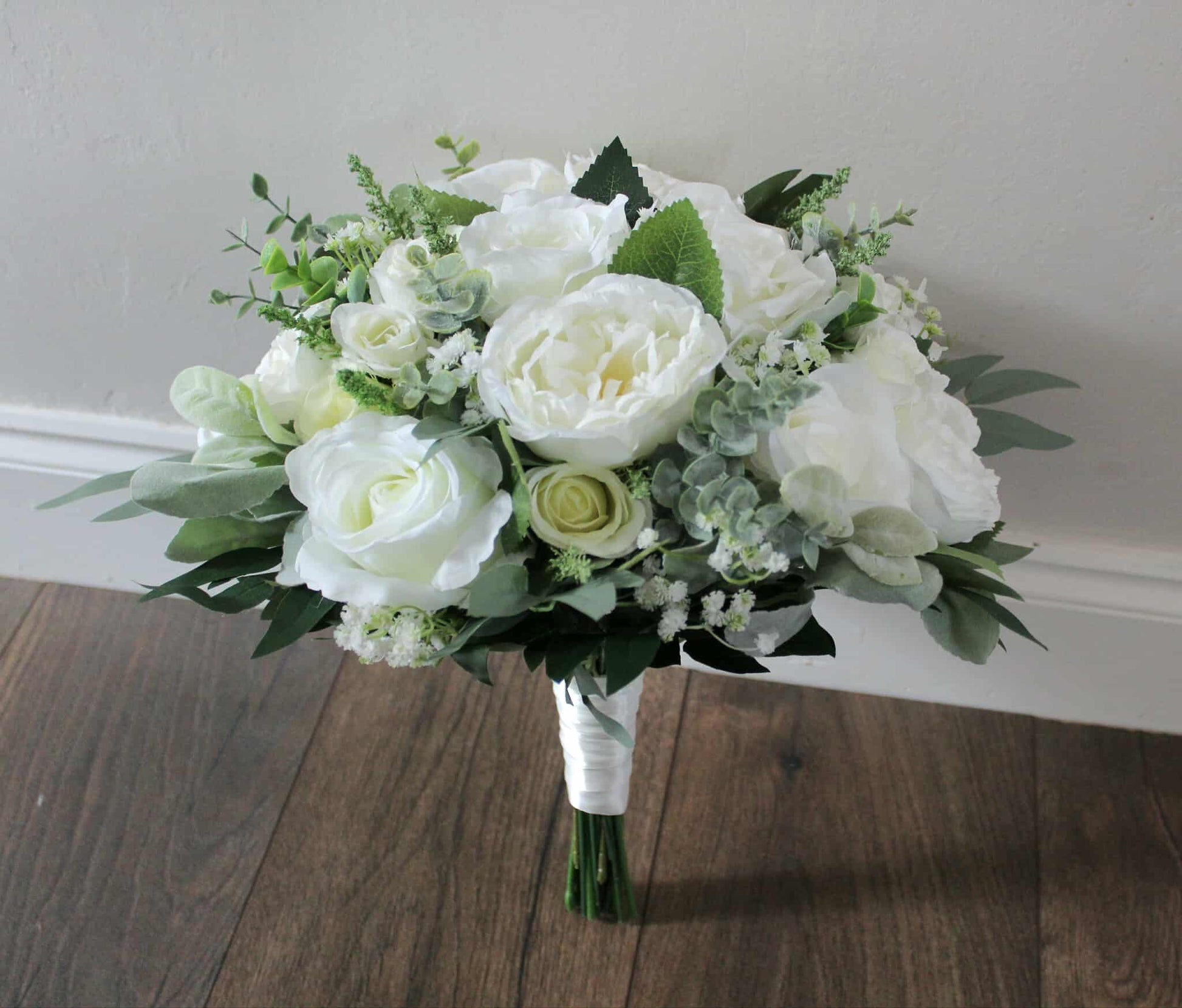 A beautiful handmade bridal bouquet created using silk roses, peonies, eucalyptus, willow leaves, lambs ear leaves and gypsophilia.