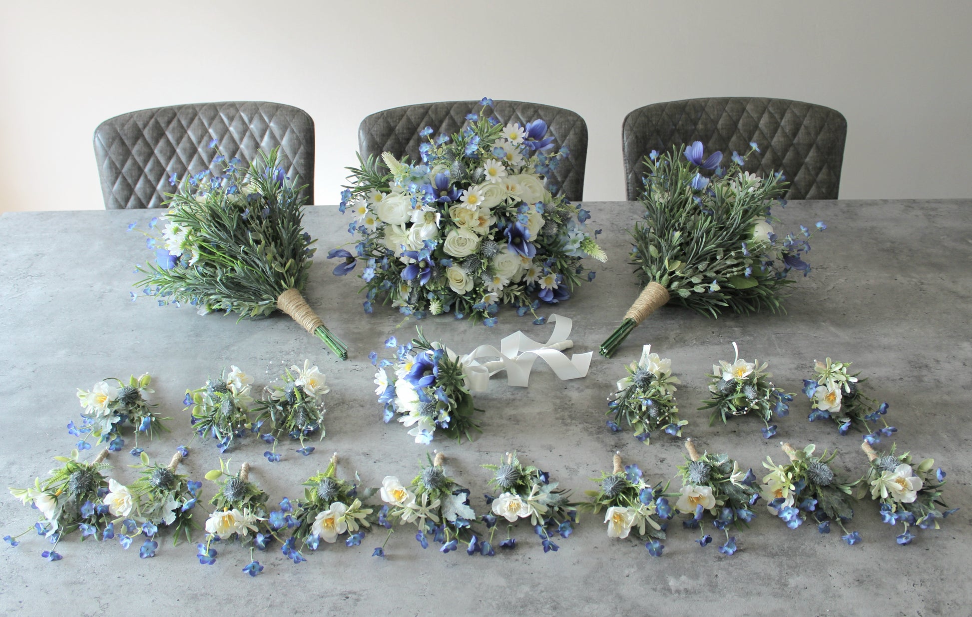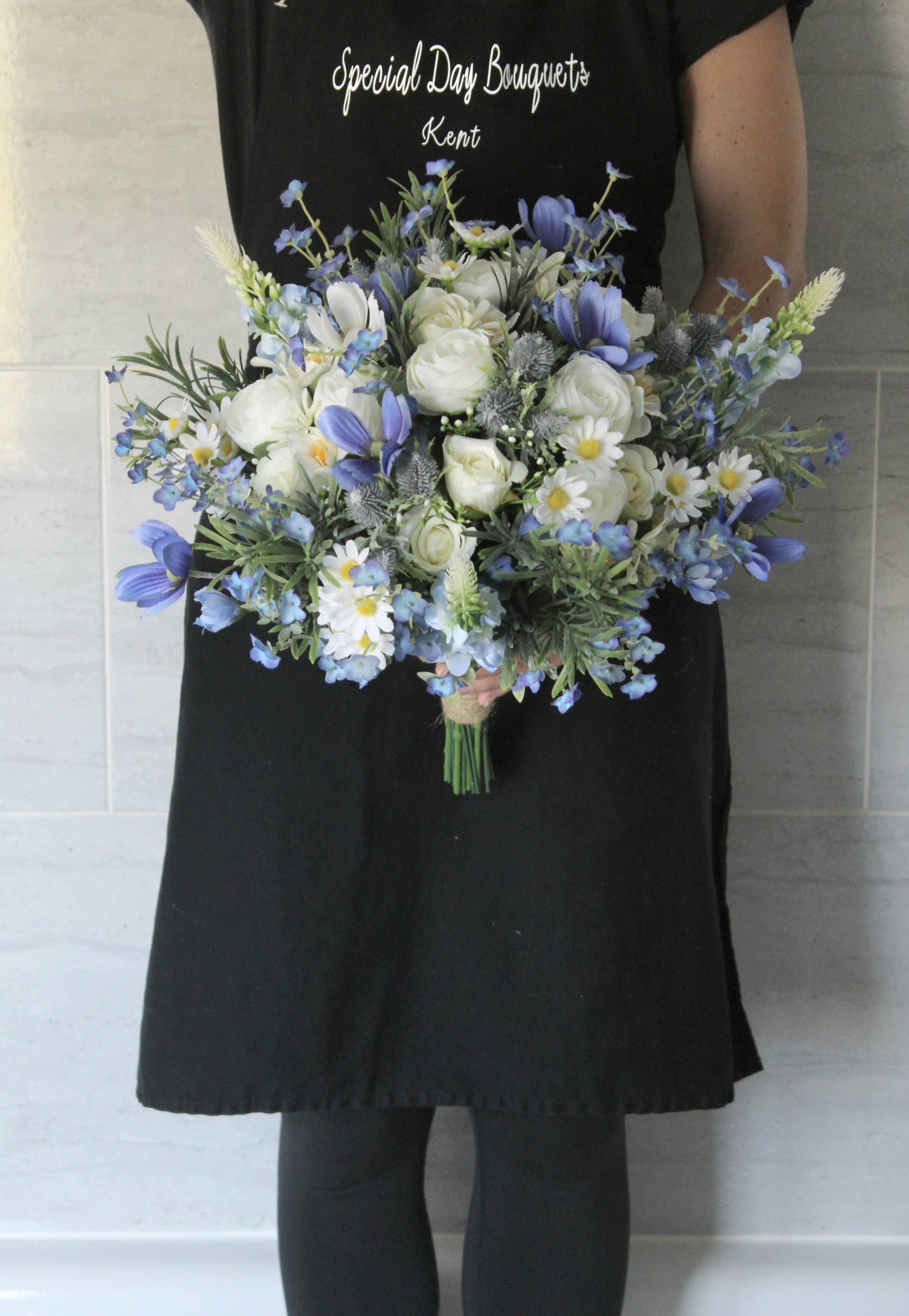 A wild flower inspired handmade bridal bouquet created using very high grade single stem silk roses, daisies, cosmos, ranunculus, thistles, blossom, delphinium, and rosemary.