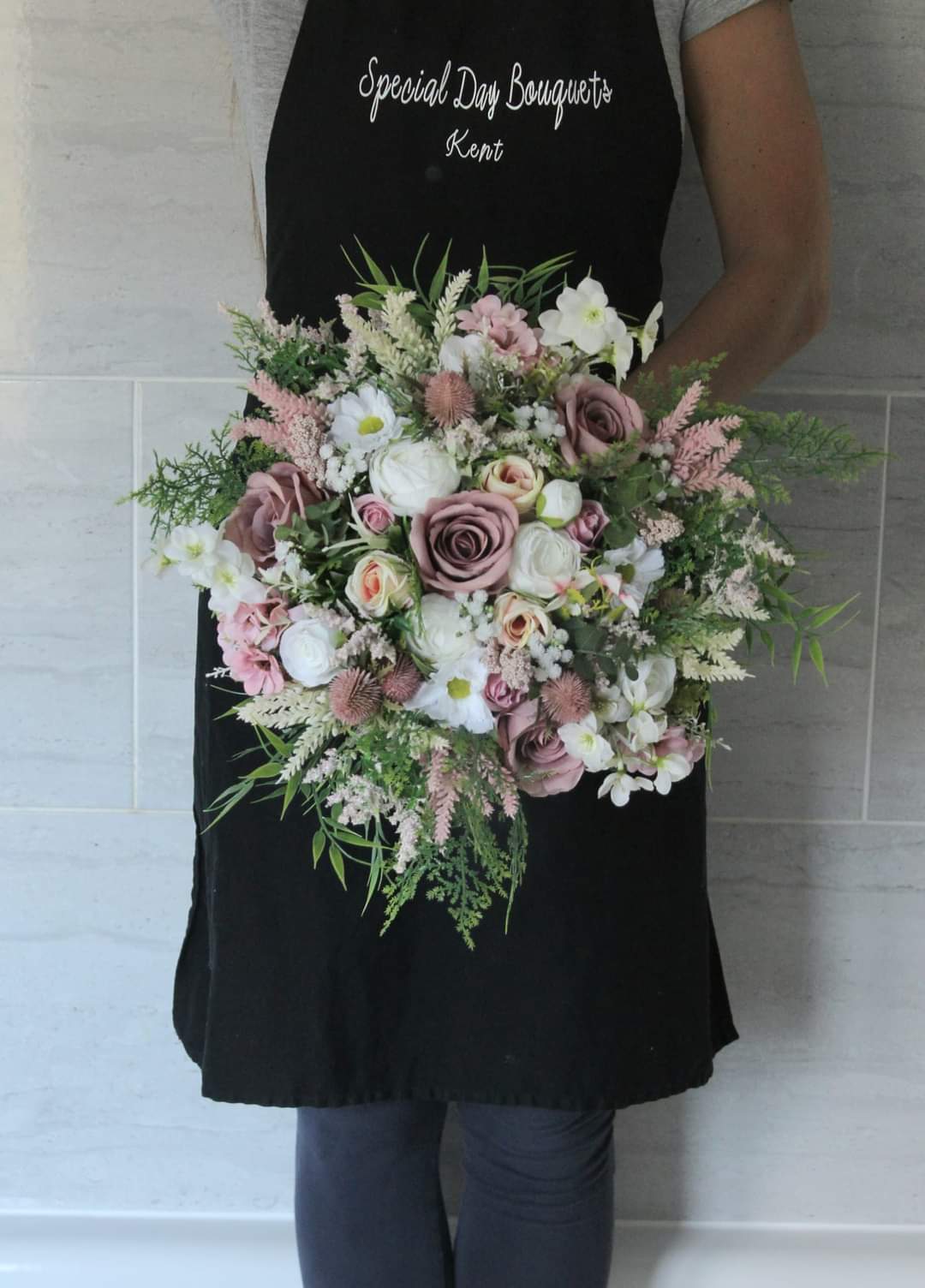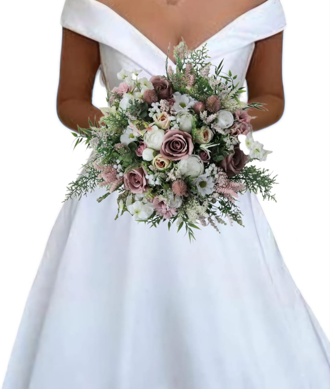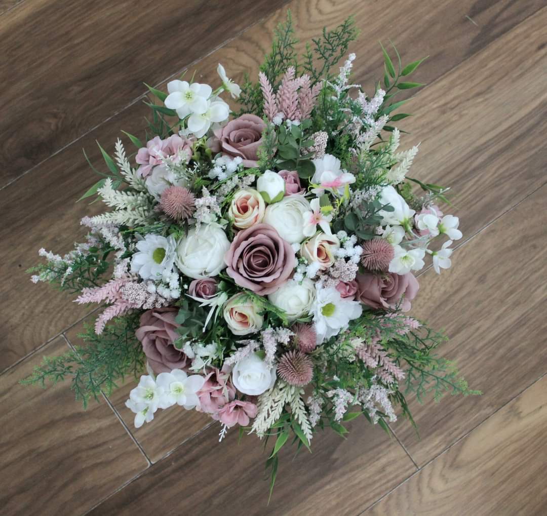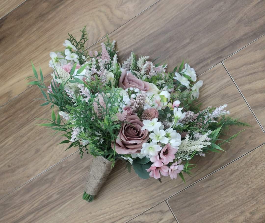 A wild flower inspired handmade bridal bouquet created using very high grade single stem silk roses, astilbe, eucalyptus, ranunculus, thistles, daisies, blossom, delphinium, cedar, bamboo leaves, gypsophilia and heather.