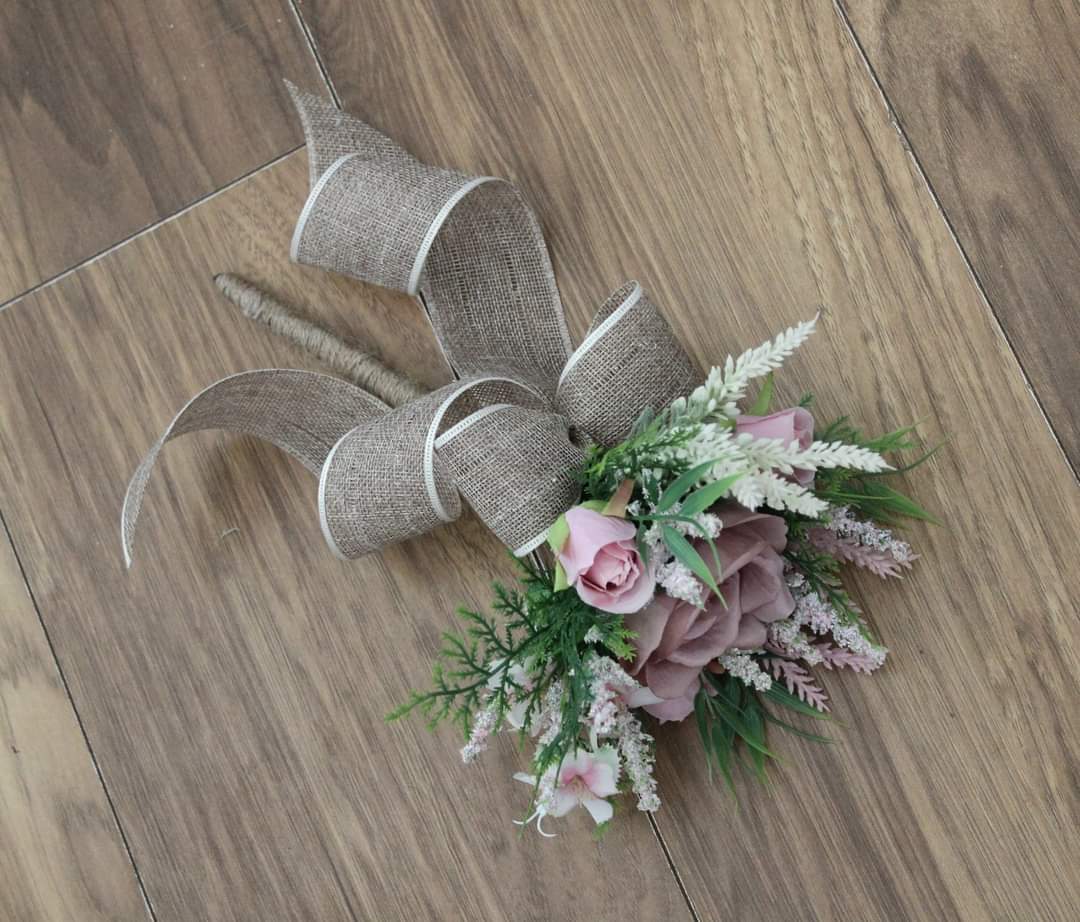 A stunning handmade flower girl wand created using high grade single stem silk roses, astilbe, cedar, bamboo leaves and blossom. Wrapped in hessian ribbon