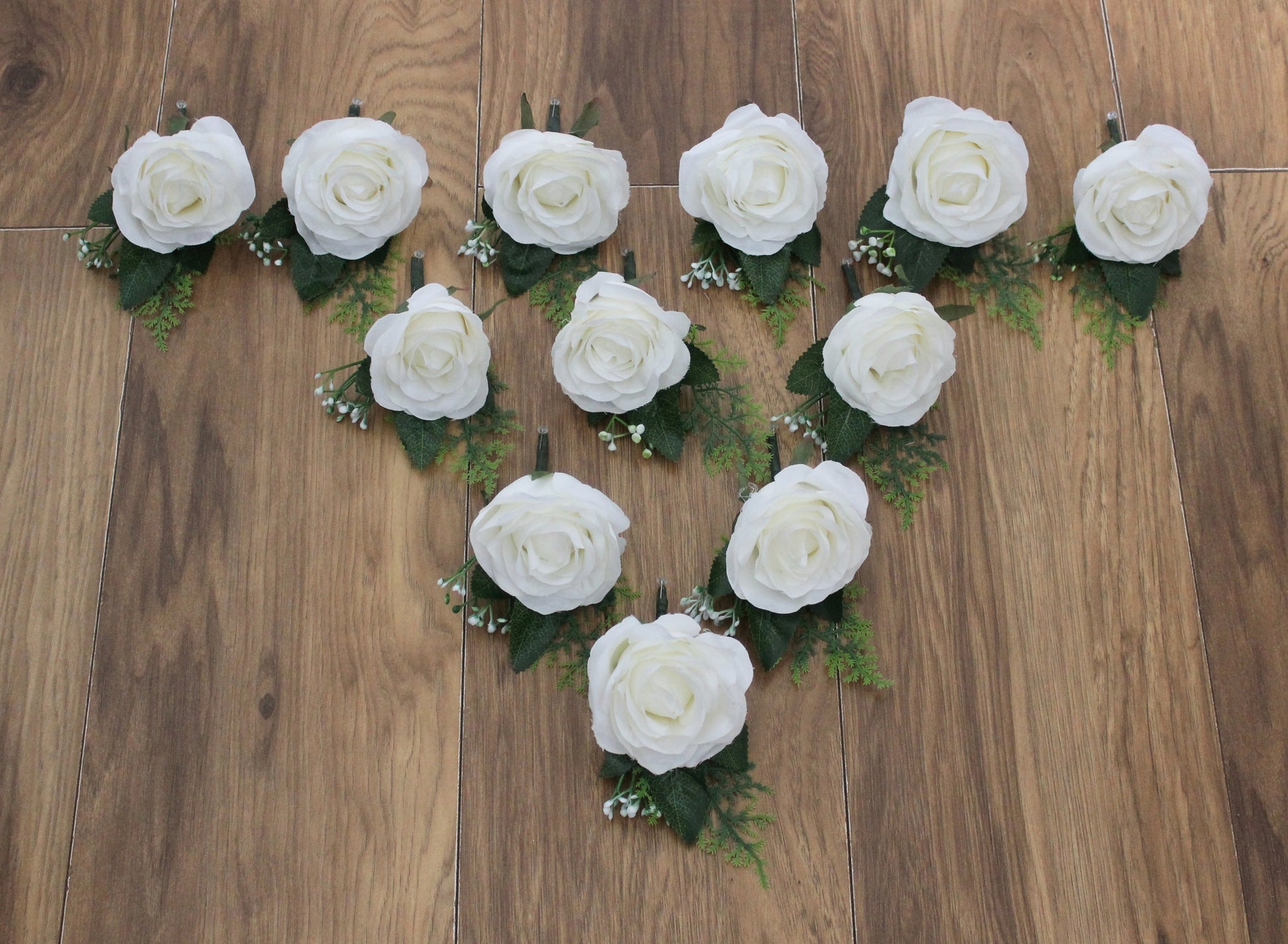 A stunning handmade buttonhole or corsage created using a silk rose, rose leaves, gypsophilia and cedar.