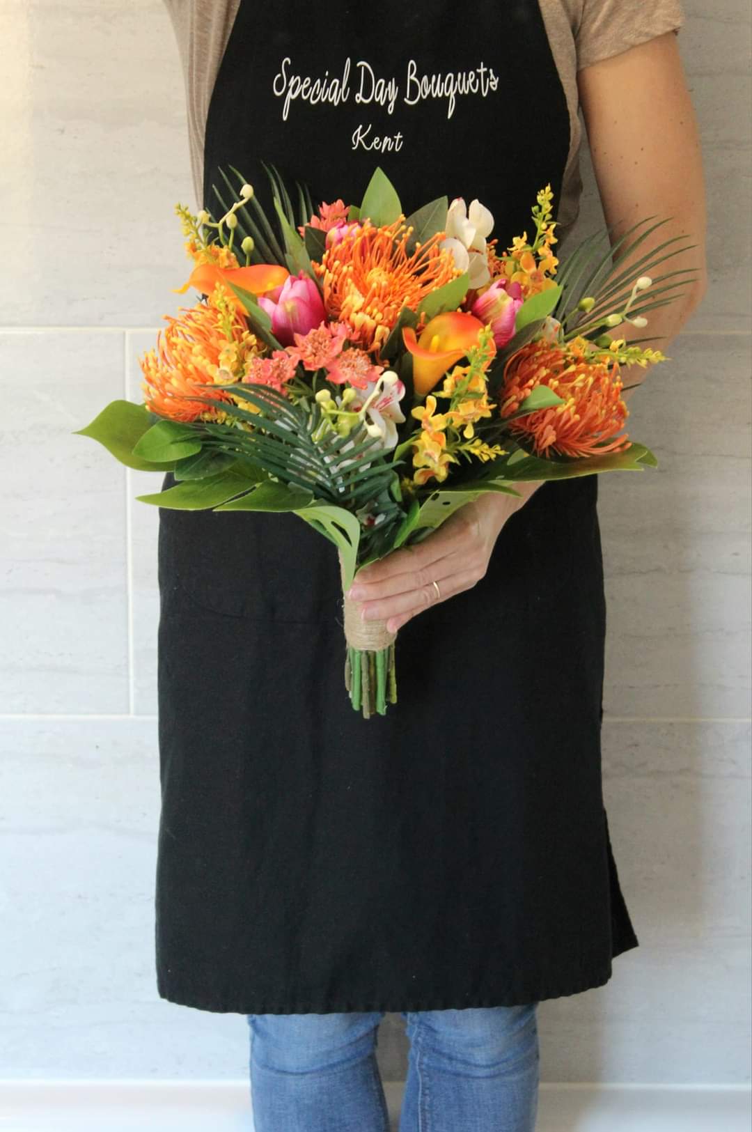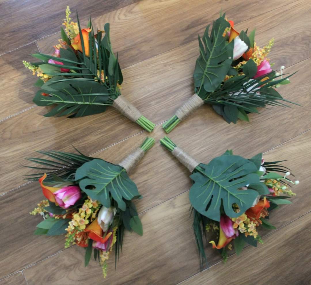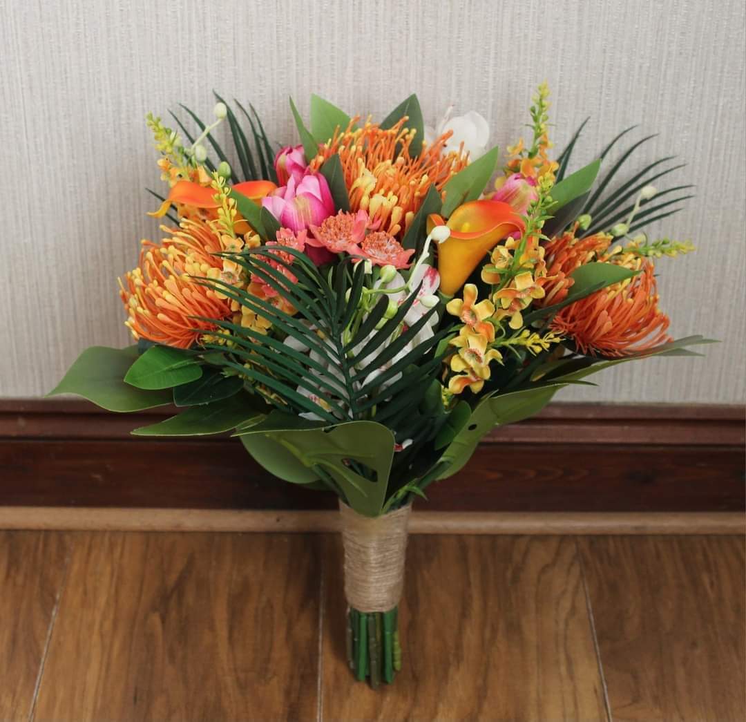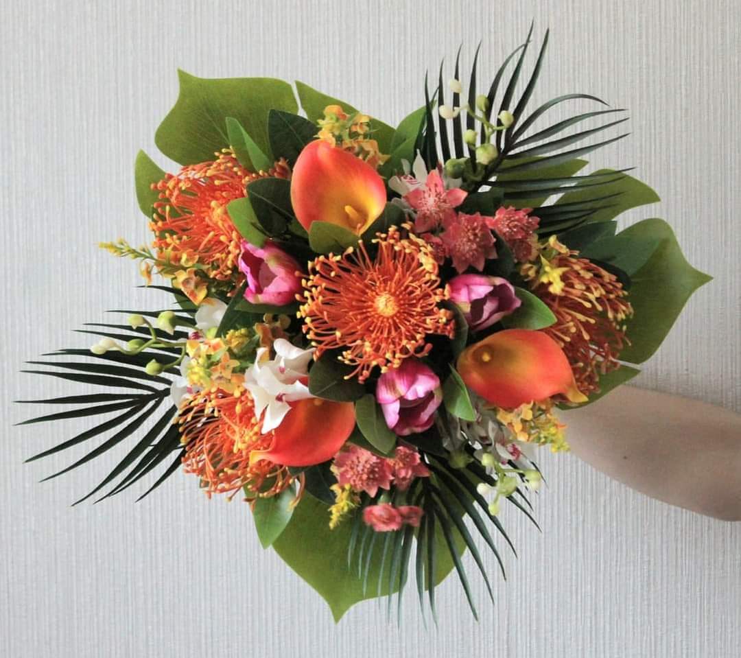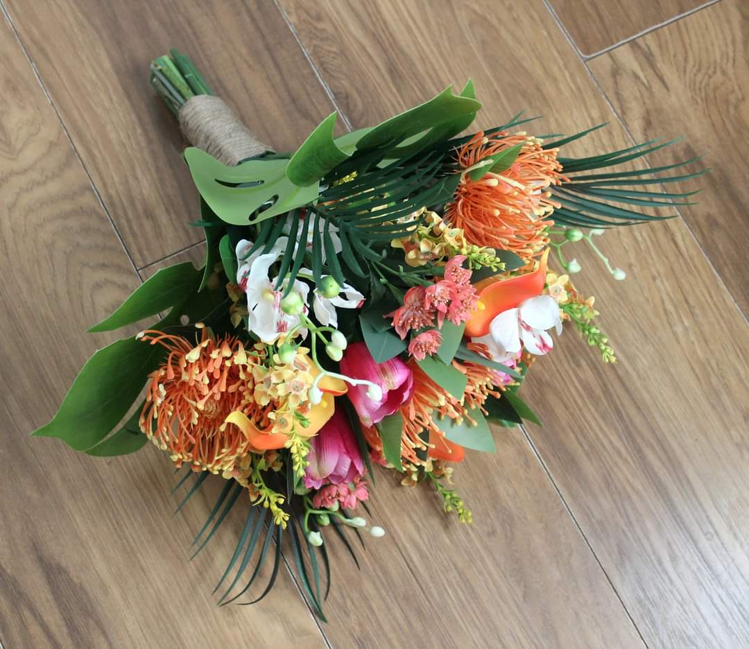 A tropical themed handmade bridal bouquet, ideal for a Caribbean wedding, created using very high grade single stem silk protea, calla lilies, orchids, tulips, astrantia, catmint, monstera leaves, ficus and palm leaves