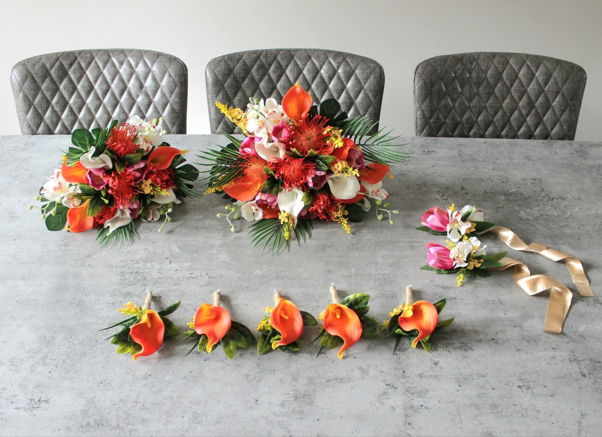 Tropical themed buttonholes created using a real touch calla lily, catmint and leafy greenery. Stem is wrapped in natural twine string