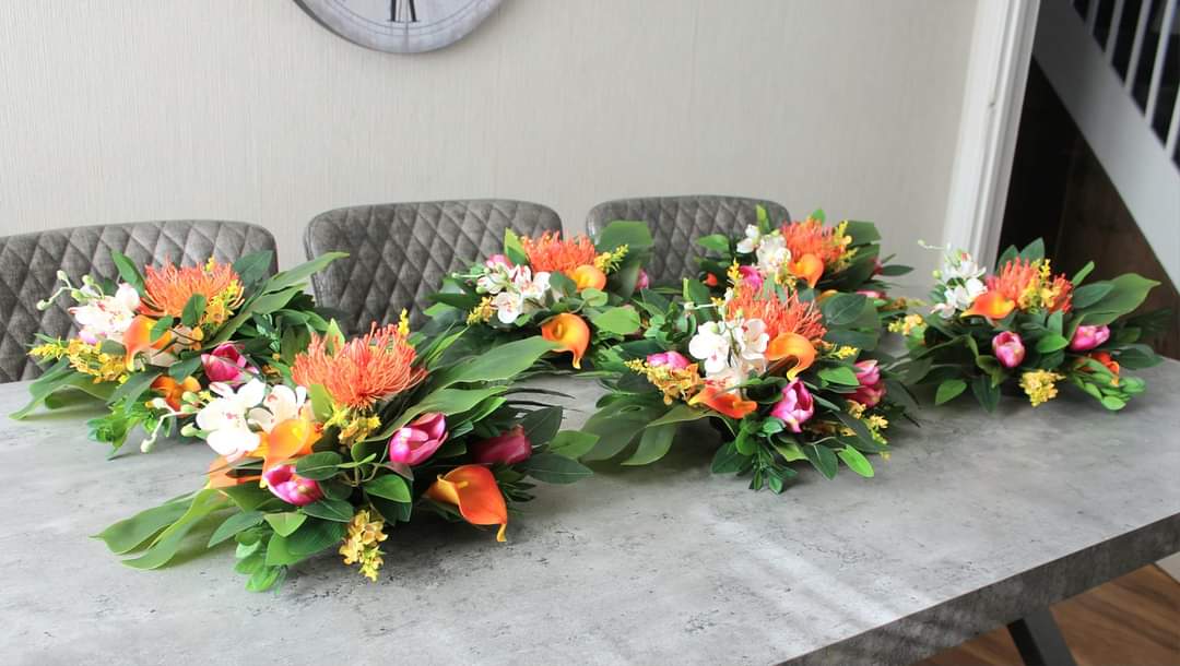 A tropical handmade table centrepiece, perfect for a Caribbean wedding, created using very high grade single stem silk protea, orchids, calla lilies, catmint, ficus, tulips, monstera leaves and palm leaves