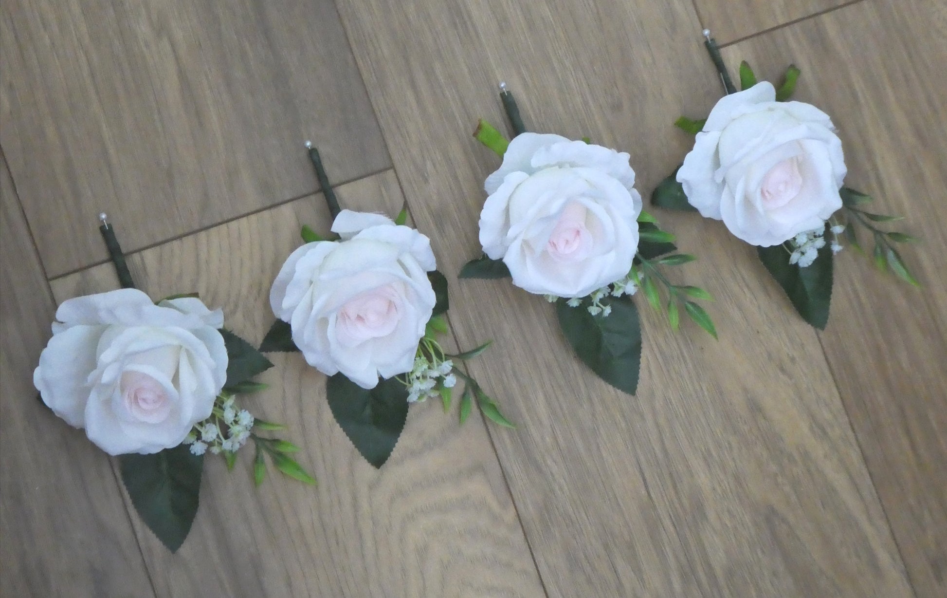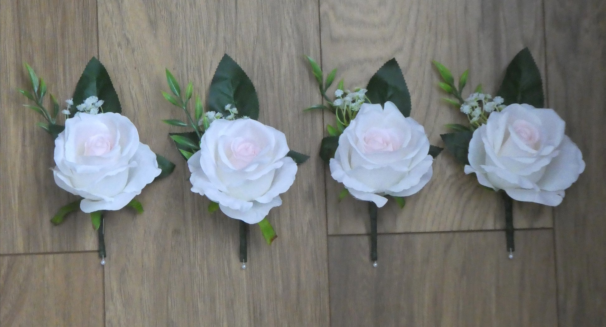 Beautiful buttonholes created using a high grade silk rose, rose leaves gypsophilia and fern