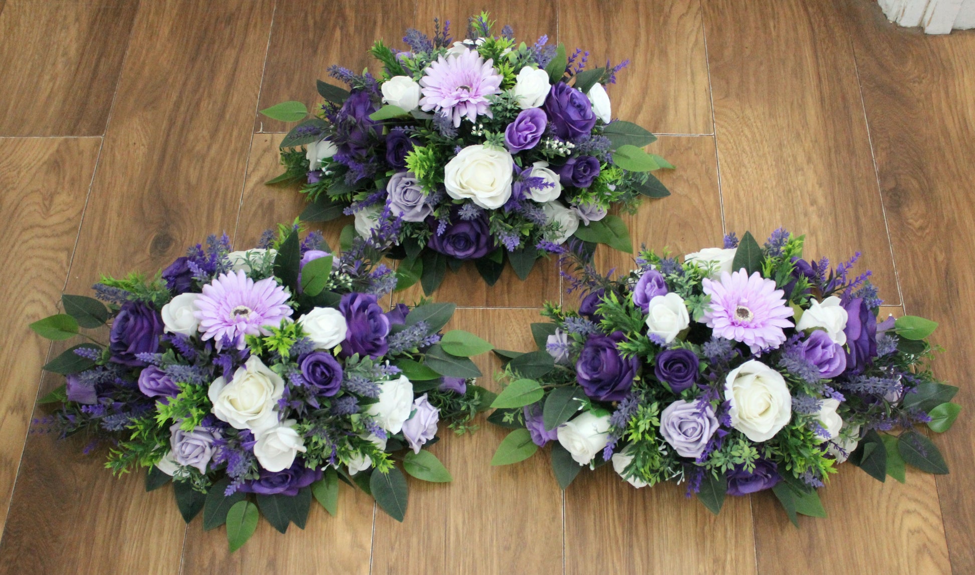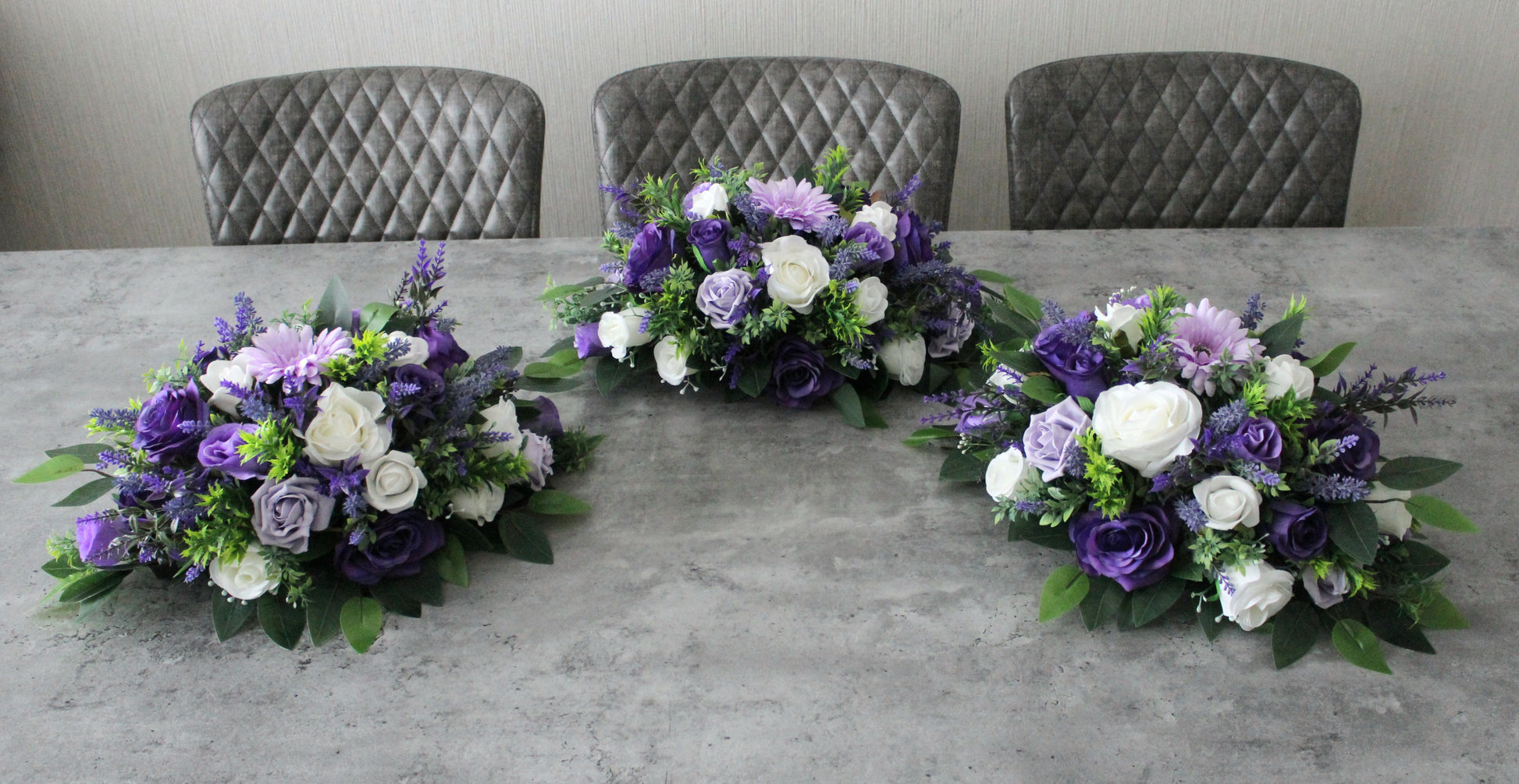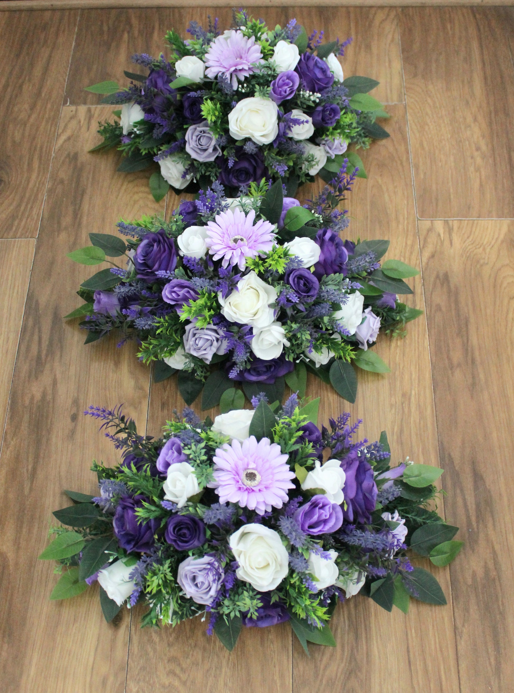 A striking handmade table centrepiece created using high grade single stem silk roses, gerberas, astilbe, fucus, tea leaves, gypsophilia, lavender and colourfast foam roses.This design can be made in other colours