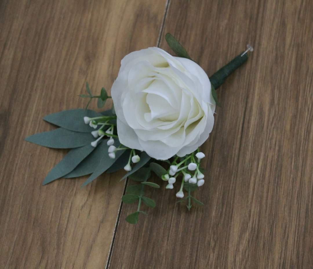 Medium rose buttonhole contains gypsophila, eucalyptus and willow leaves