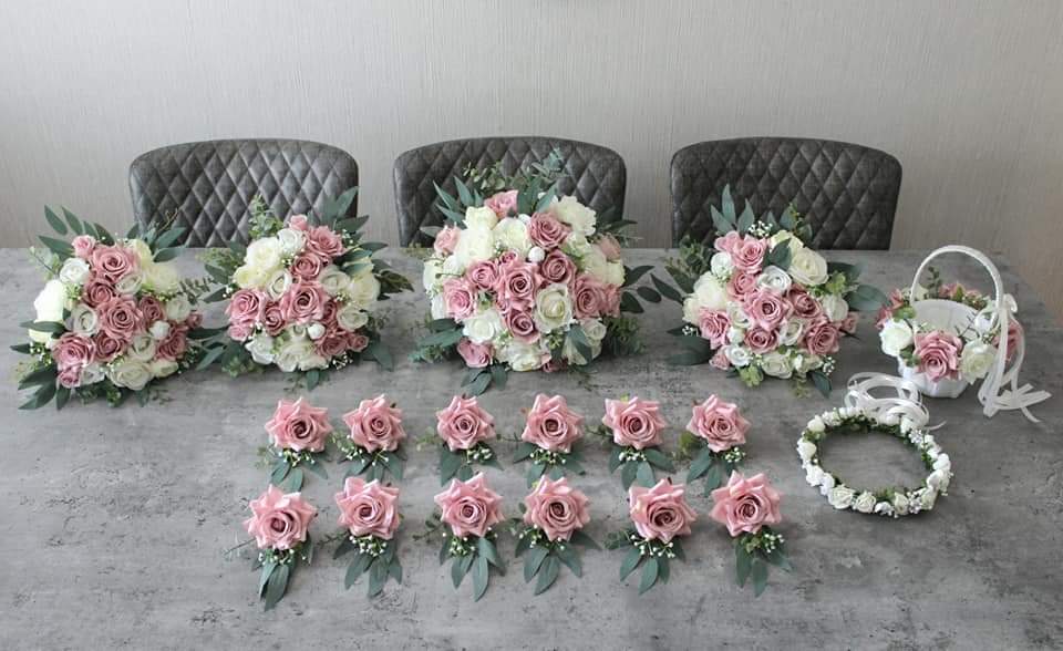 These classic buttonholes contain a very high grade single stem silk diamond rose, gypsophilia, eucalyptus and willow leaves