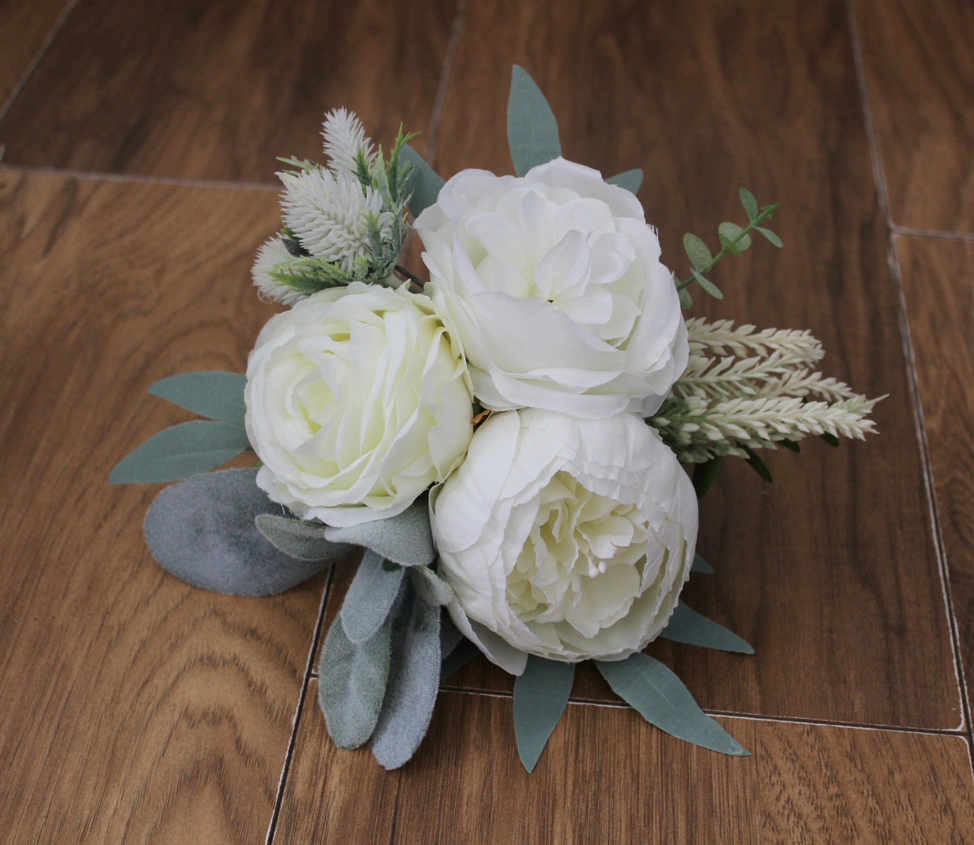 A Wonderful cake flower arrangement created using a single stem silk peony and roses, with thistles, eucalyptus, willow leaves, astilbe, lambs ear and thistles
