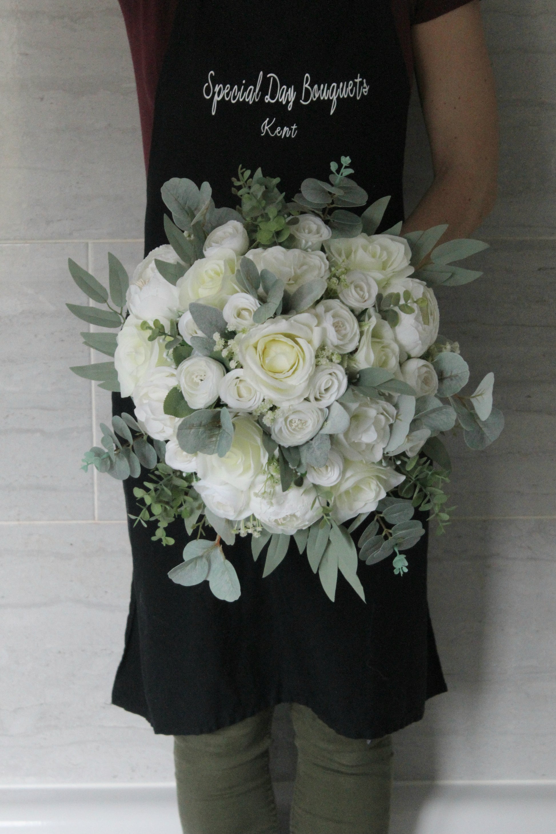 A beautiful handmade bridal bouquet created using silk roses, peonies, eucalyptus, willow leaves, ranunculus and gypsophilia.