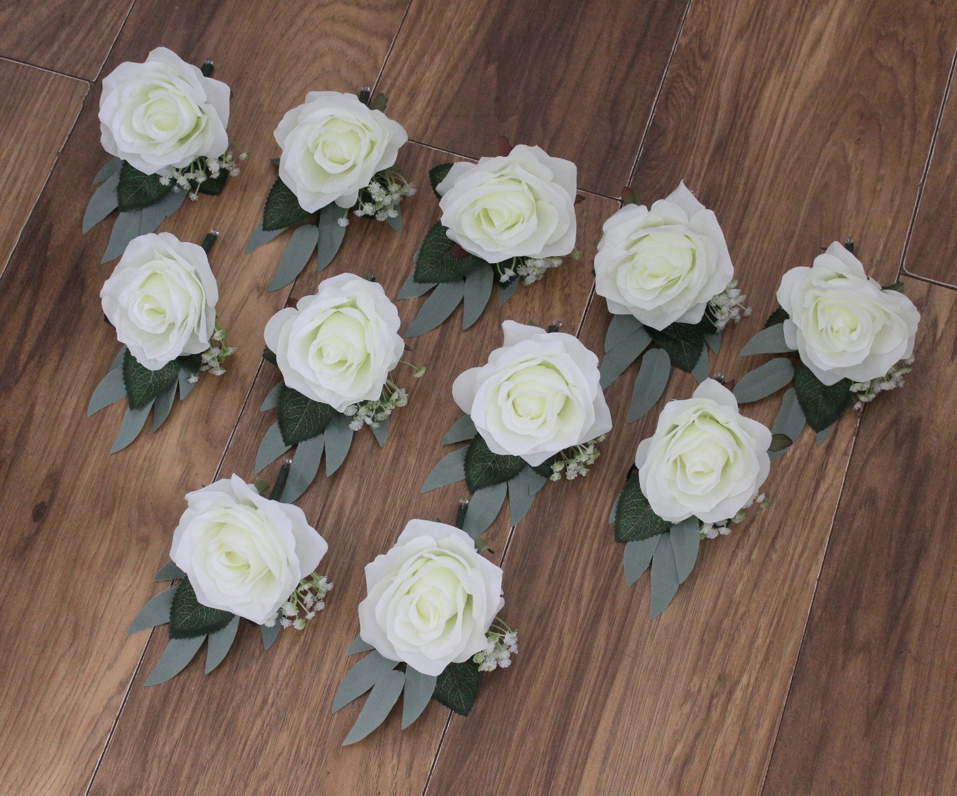 These classic buttonholes are created using very high grade silk flowers and foliage. They contain a large open rose, rose leaves, gypsophilia and willow leaves