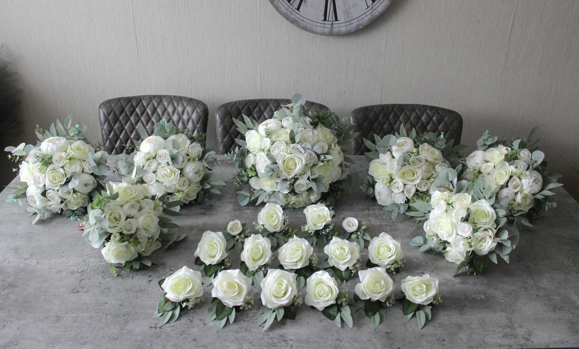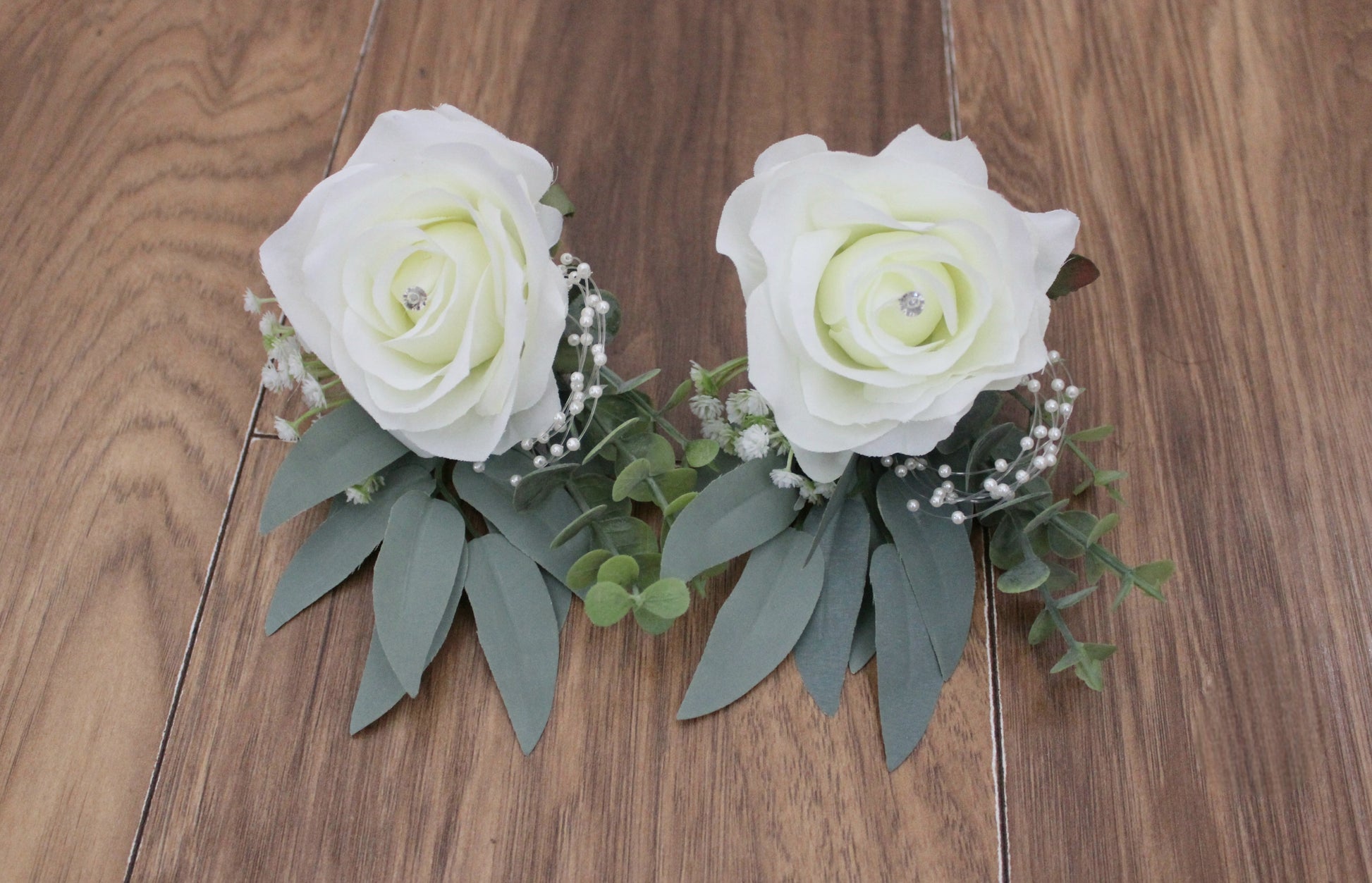Ladies corsage, ideal for Mother of the Bride and Groom. Contains a medium size diamond rose, willow leaves, gypsophilia, eucalyptus, and pearl loops.