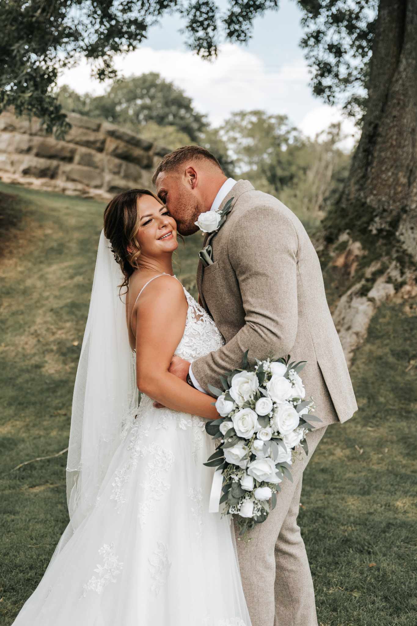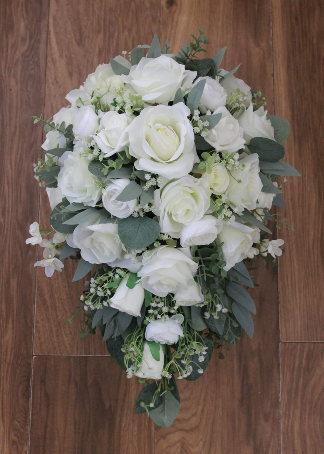 A Classic handmade bridal bouquet created using high grade single stem silk roses, eucalyptus, willow leaves, ranunculus, delphinium and gypsophilia.
