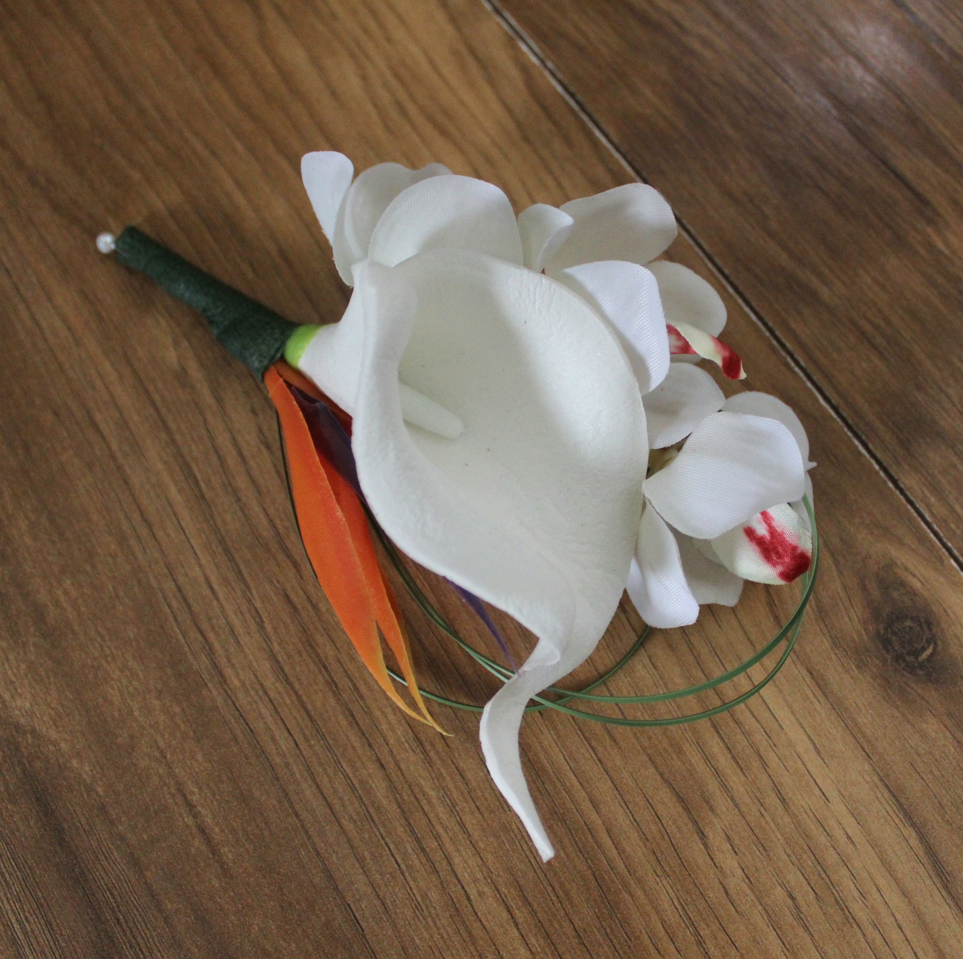 Real touch calla lily, orchid spray, birds of paradise, mini hyacinth and bear grass