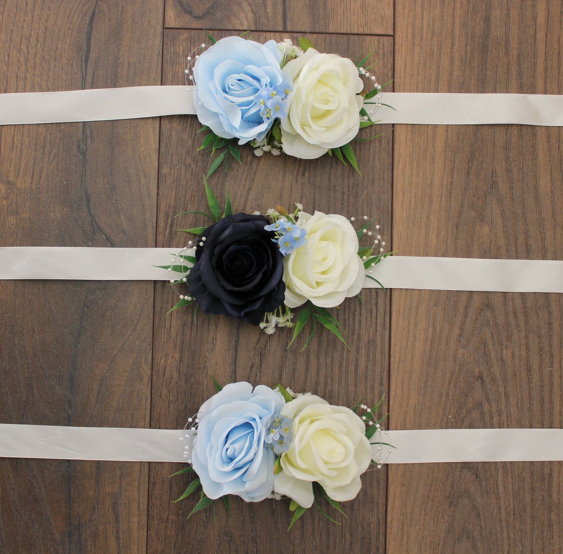 Photo shows baby/sky blue or navy and ivory roses set upon ivory ribbon.