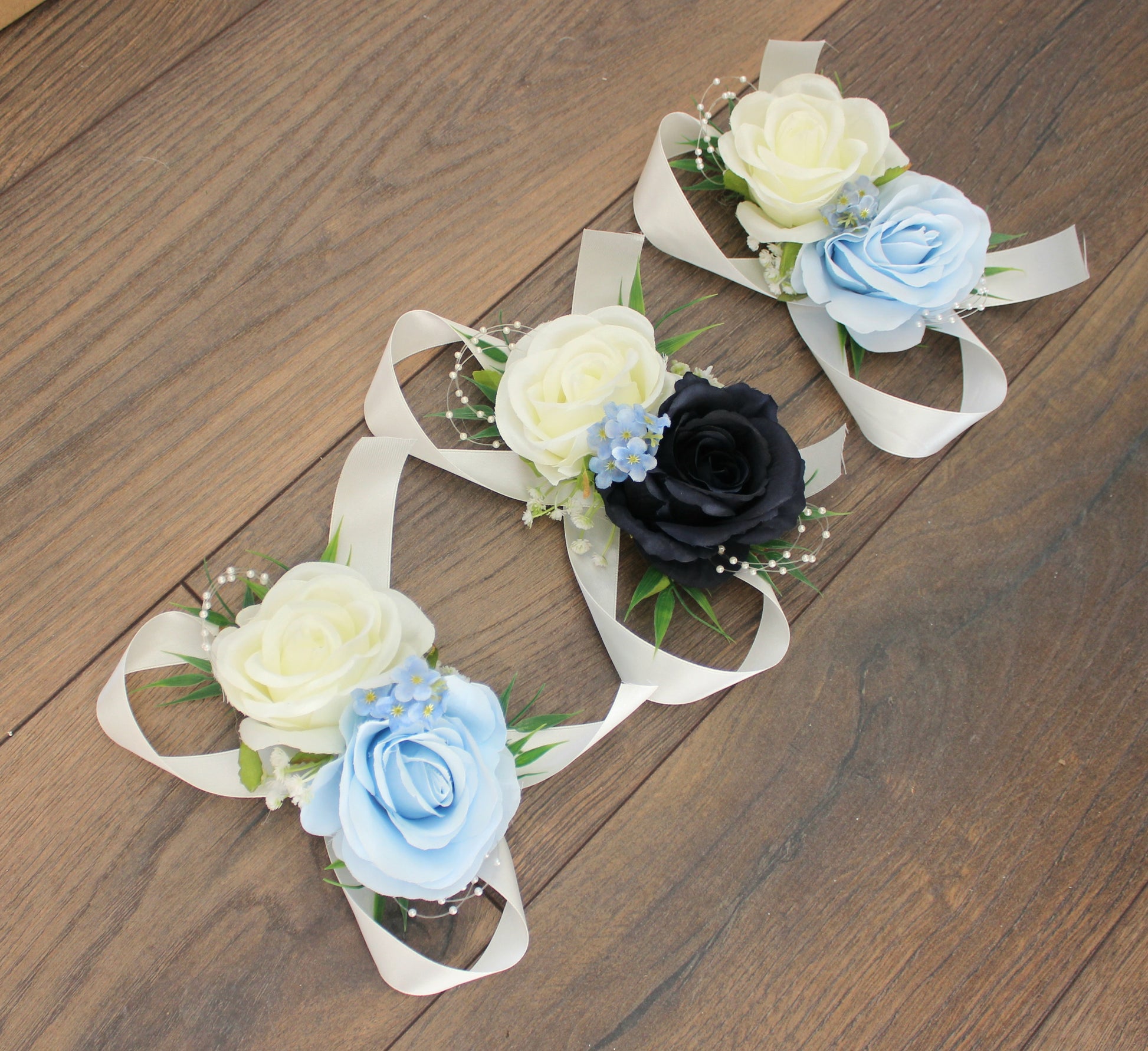 A beautiful handmade wrist corsage created using silk roses, gypsophilia, bamboo leaves, pearl loops and forget me nots
