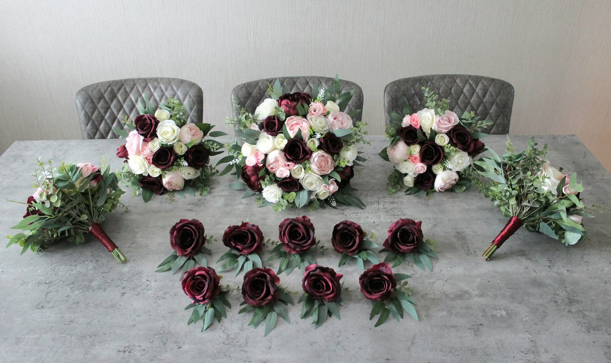 These beautiful buttonholes contain very high grade single stem silk roses, eucalyptus and willow leaves.