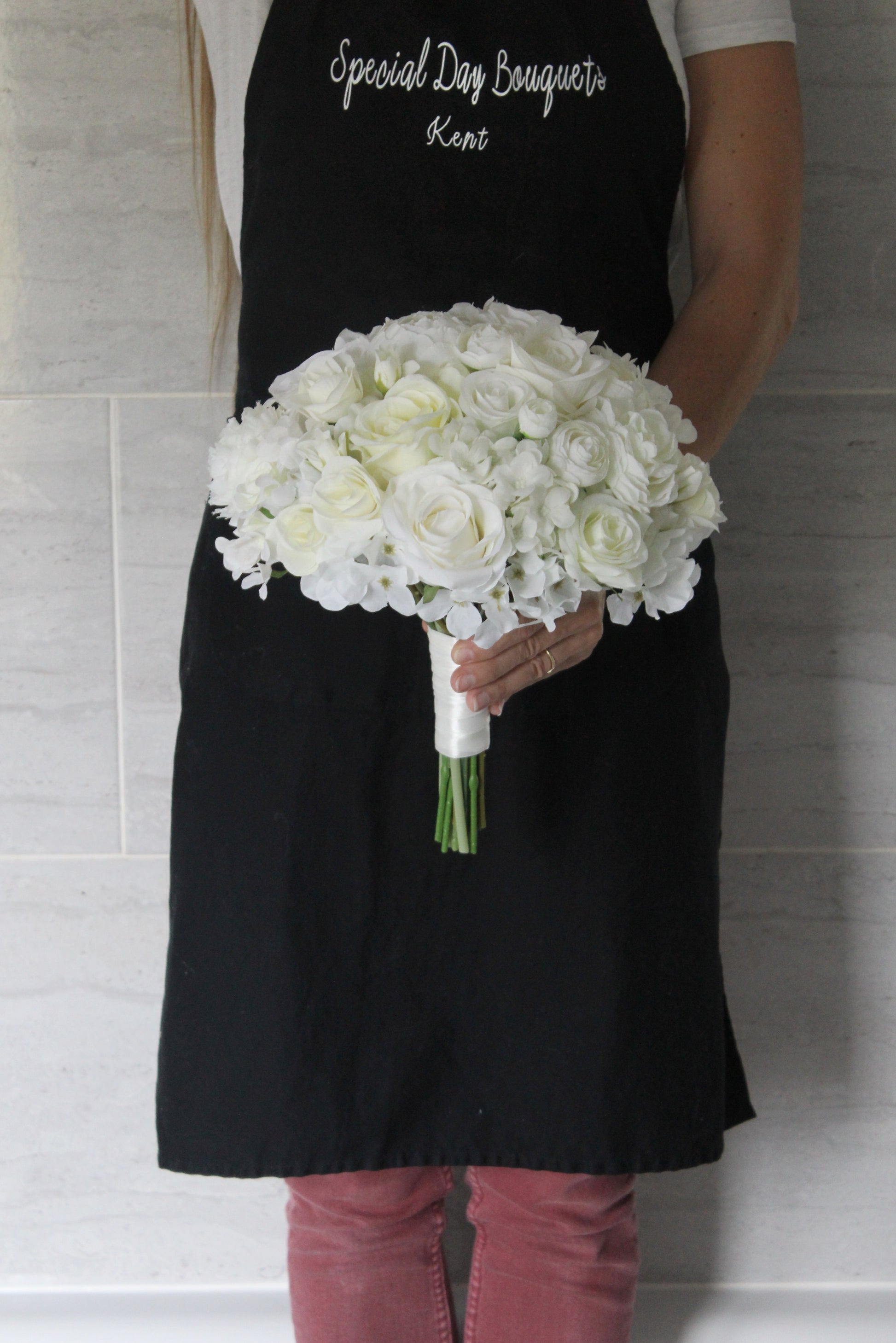 A classic handmade bridal bouquet created using silk roses, peonies, hydrangea and ranunculus.