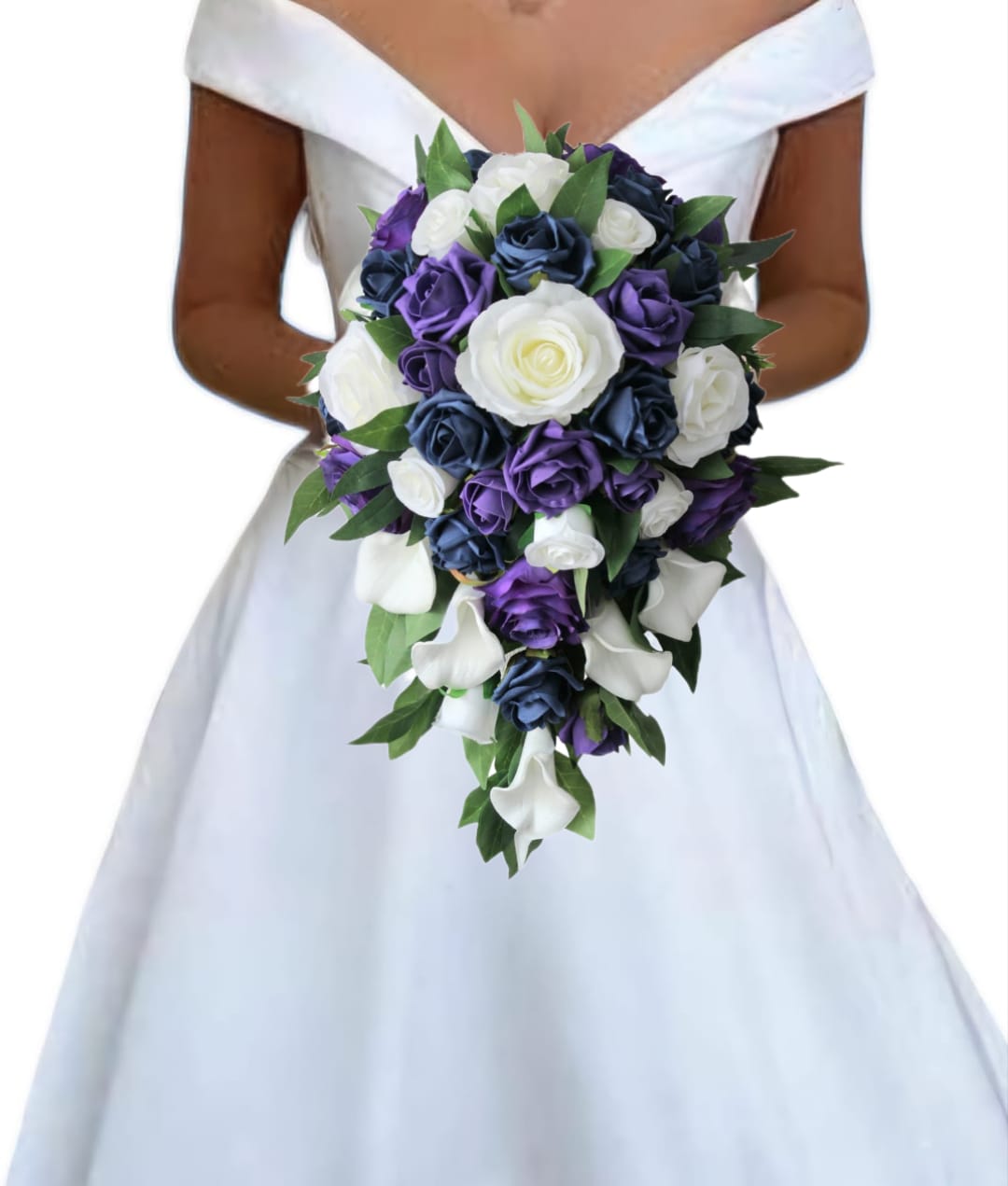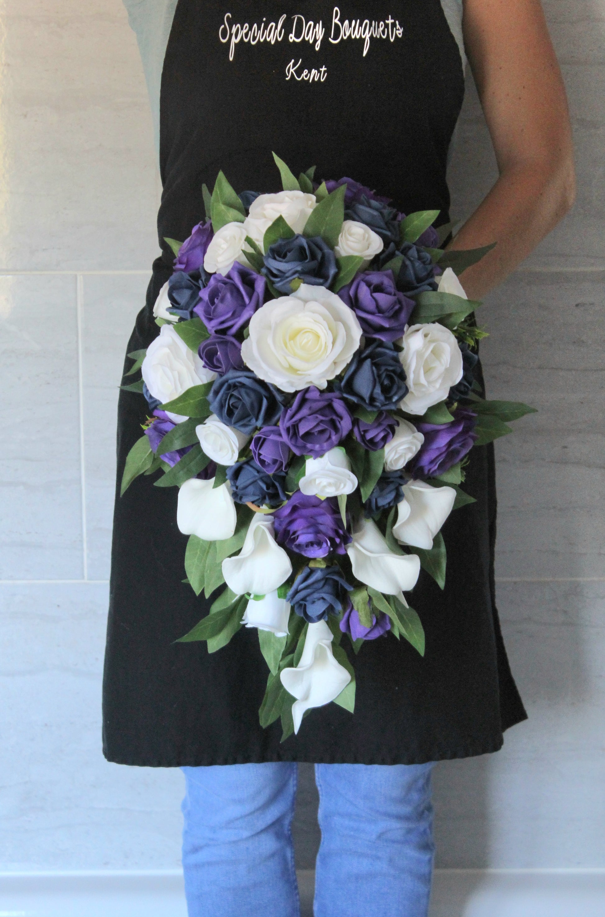 A beautiful handmade bridal bouquet created using colourfast foam roses, single stem silk roses, real touch calla lilies and shikibi leaves
